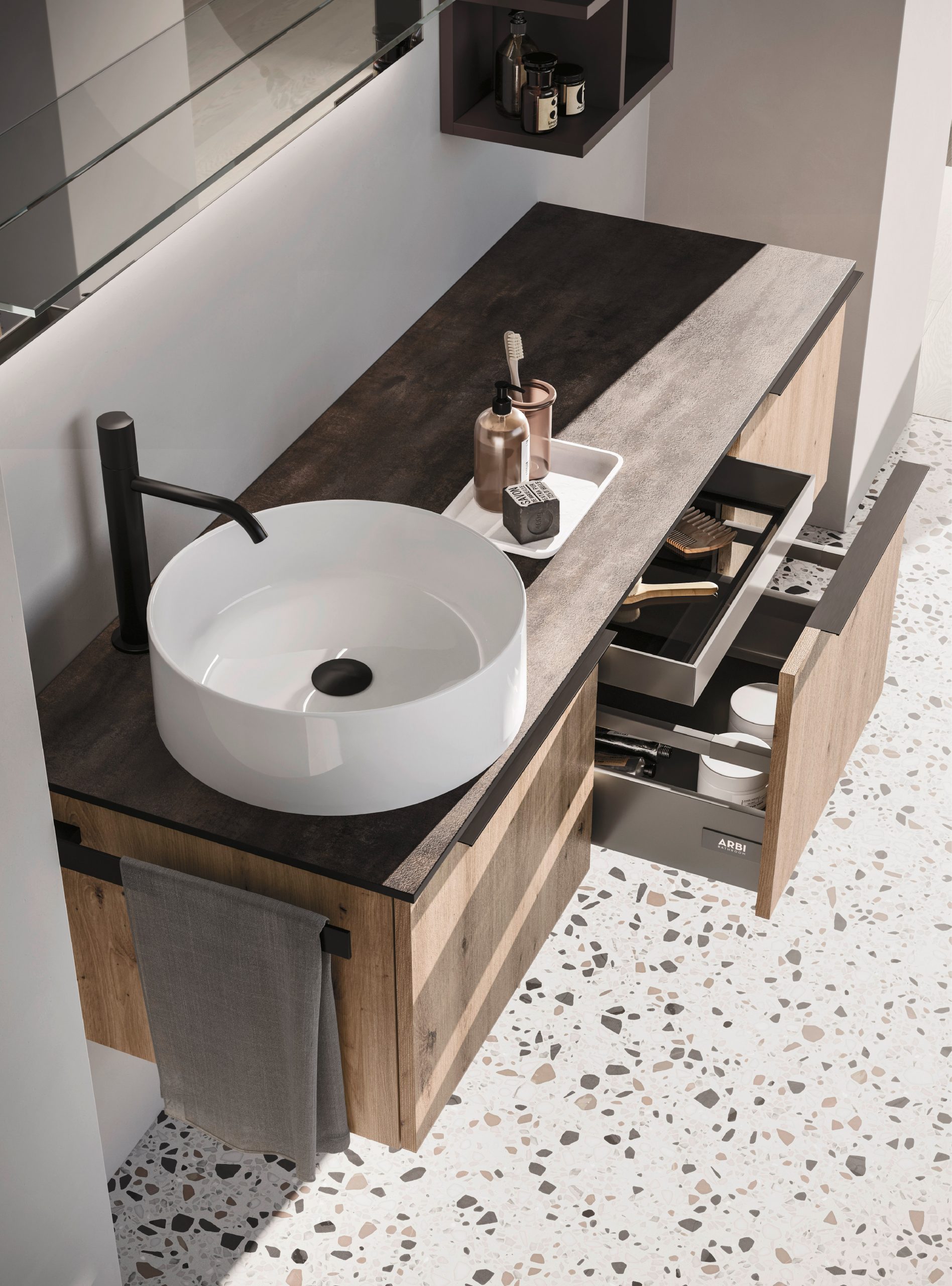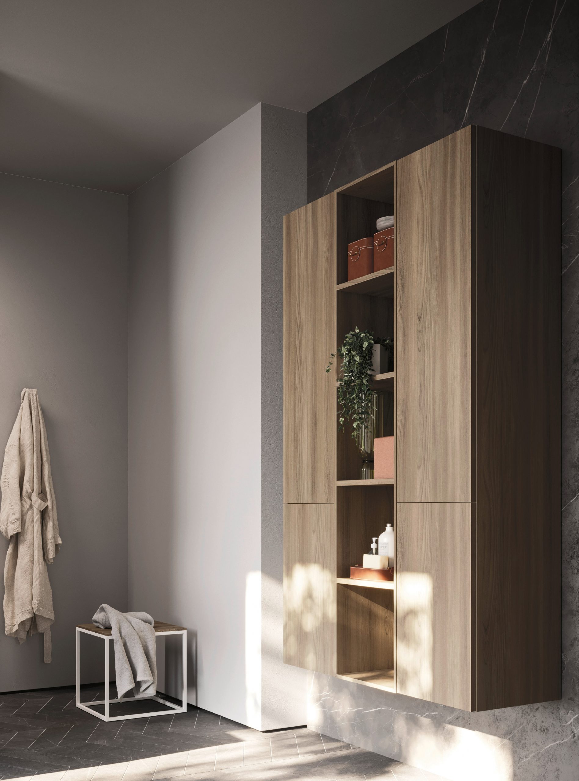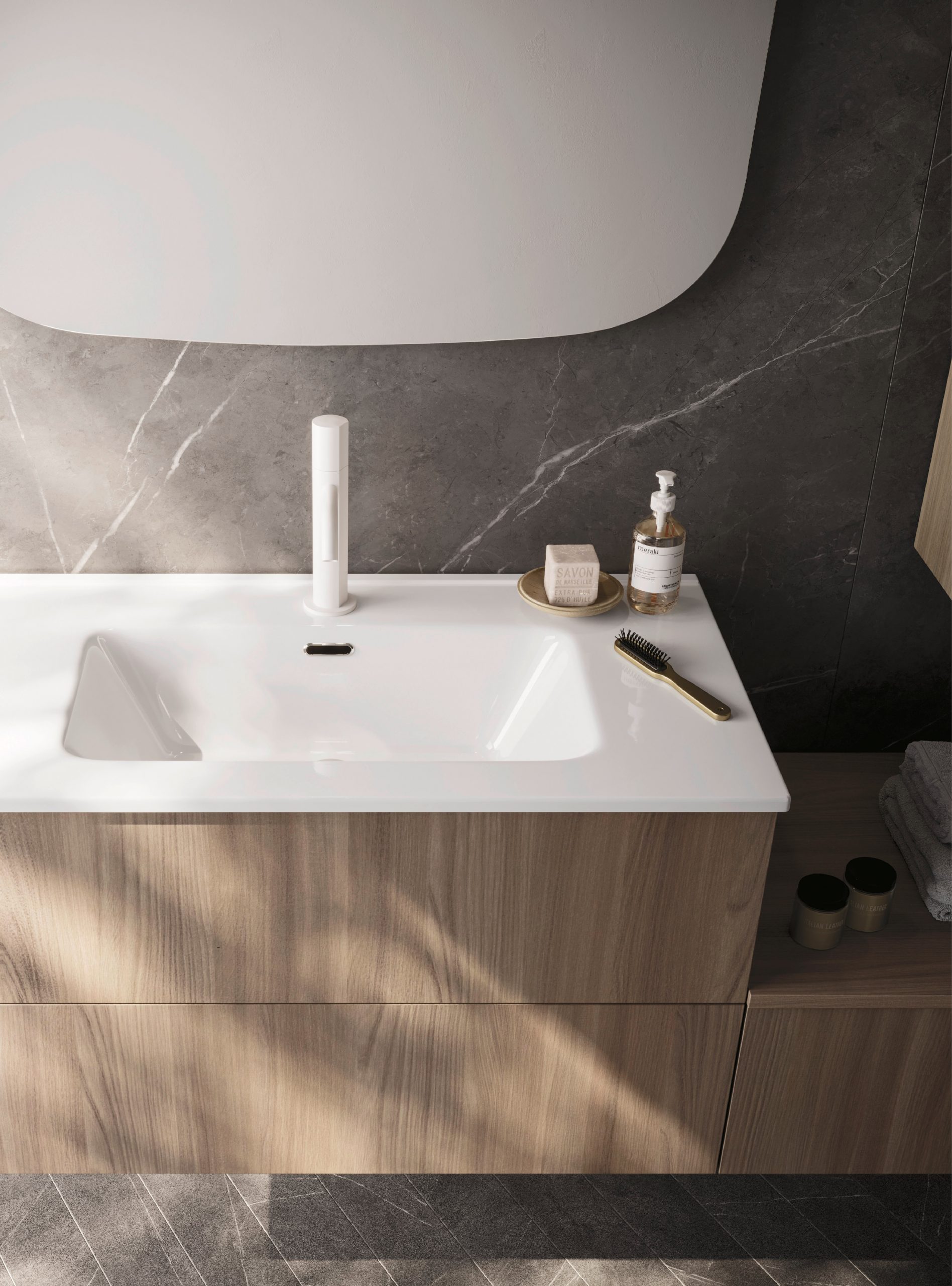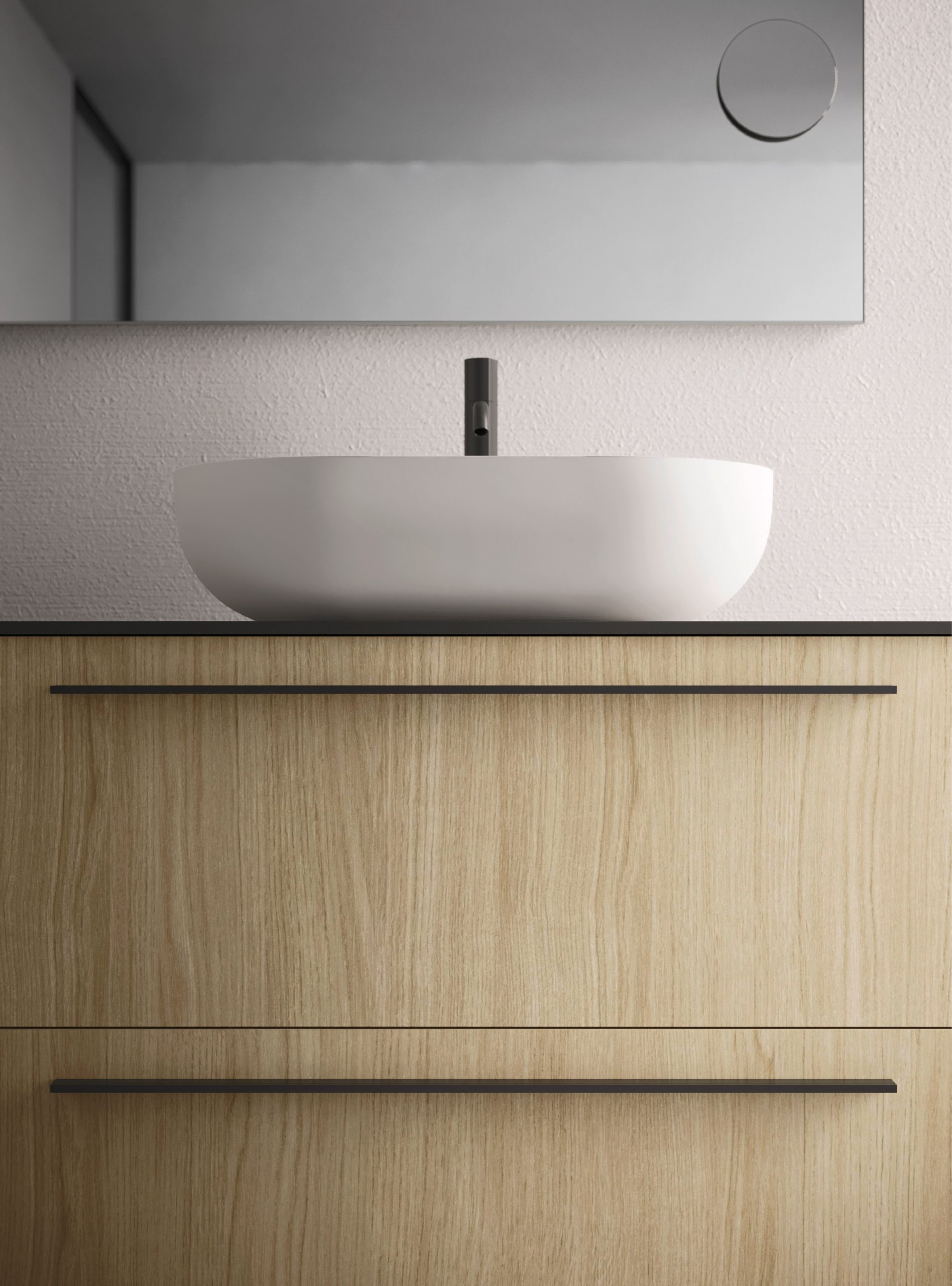 Ho.Me Plus est une collection innovante d’Arbi Arredobagno qui rassemble une large gamme de finitions en mélaminé thermostructuré avec des veines naturelles, des couleurs classiques ou tendance. La collection est disponible en deux variantes : l’une avec façade plate et poignée, l’autre avec la prise de main en « J » intégrée. Caracterisée par une grande modularité, grâce au choix entre trois profondeurs et différentes largeurs, la collection s’enrichit de la version courbée, qui propose des bases aux lignes douces pour satisfaire même les besoins d’optimisation des espaces les plus réduits.