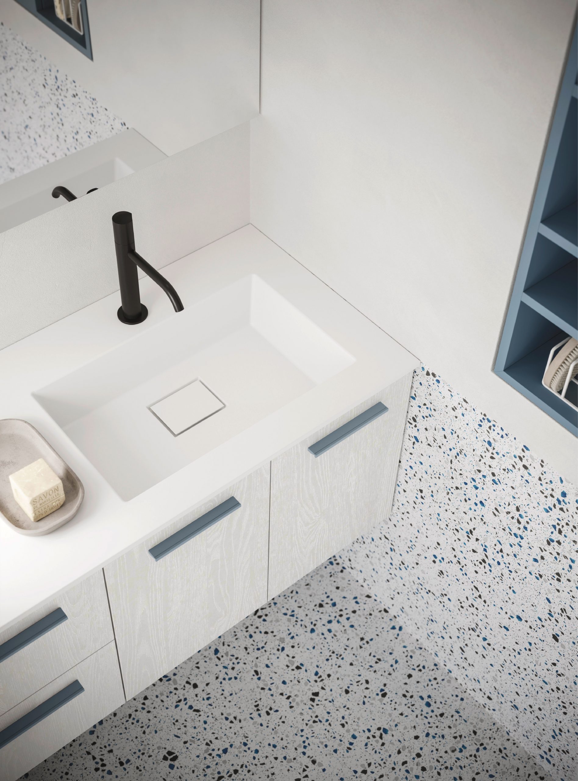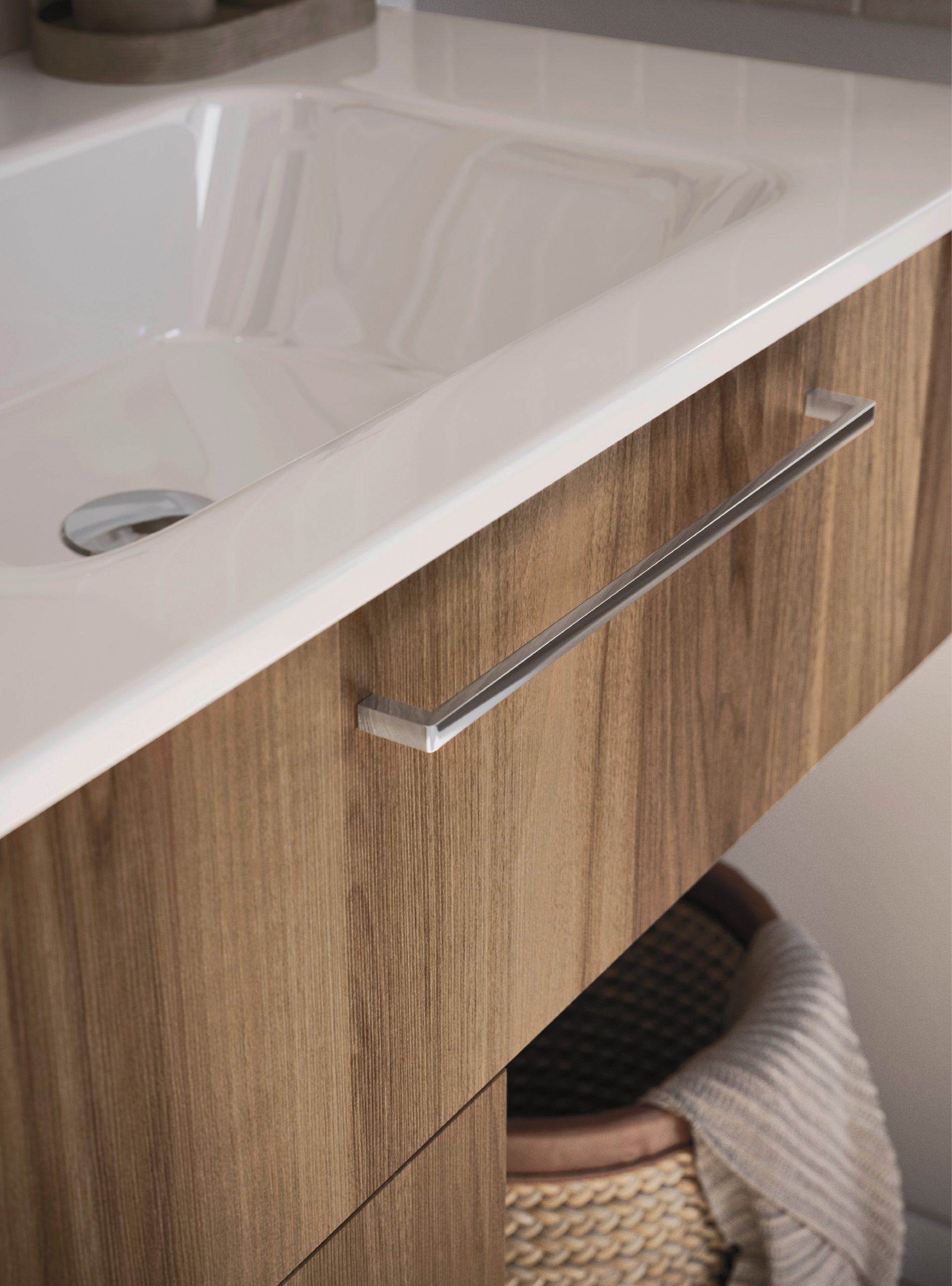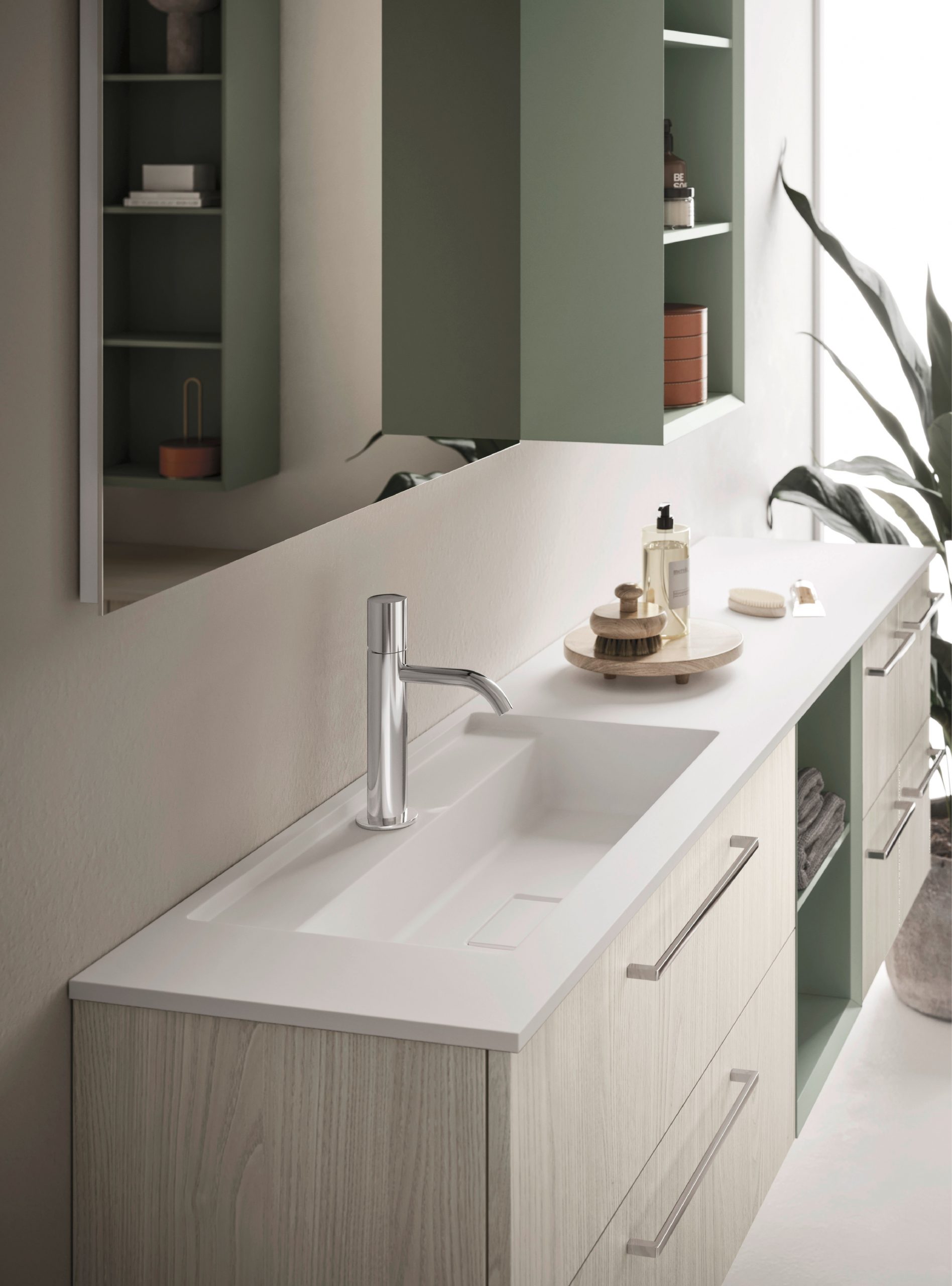 Ho.Me Plus est une collection innovante d’Arbi Arredobagno qui rassemble une large gamme de finitions en mélaminé thermostructuré avec des veines naturelles, des couleurs classiques ou tendance. La collection est disponible en deux variantes : l’une avec façade plate et poignée, l’autre avec la prise de main en « J » intégrée. Caracterisée par une grande modularité, grâce au choix entre trois profondeurs et différentes largeurs, la collection s’enrichit de la version courbée, qui propose des bases aux lignes douces pour satisfaire même les besoins d’optimisation des espaces les plus réduits.