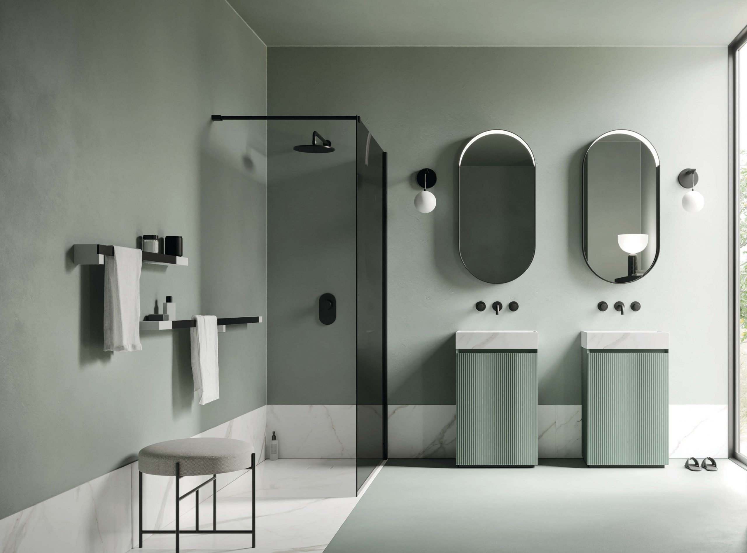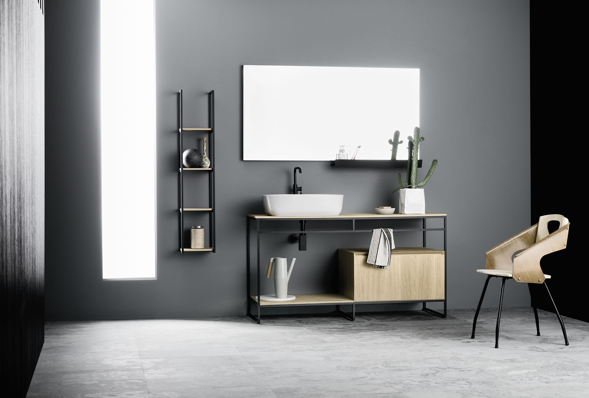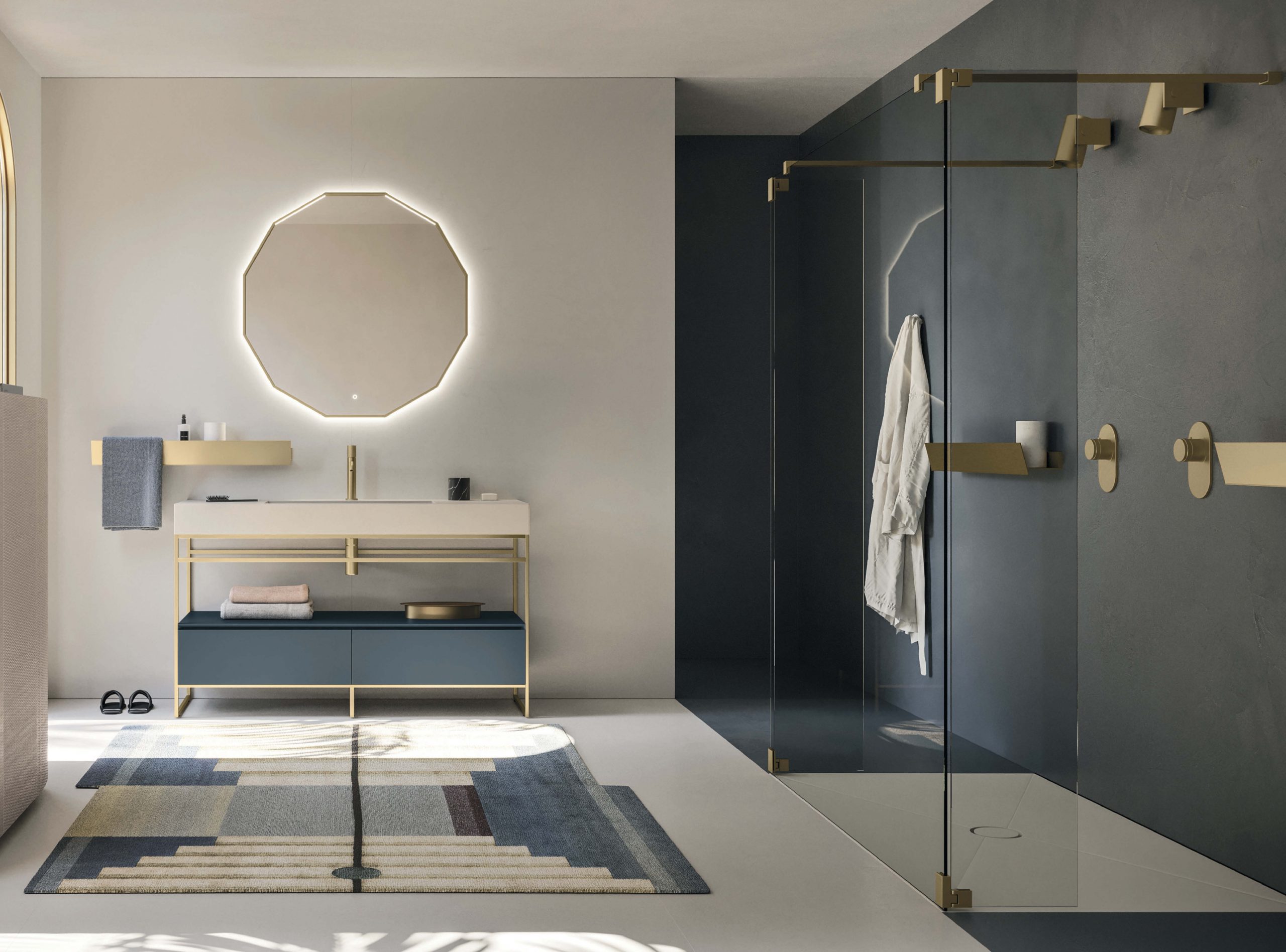 Code est une collection parfaitement alignée aux actuelles tendances de l’ameublement pour salle de bain et vise à créer des espaces ambiants avec une forte vocation au design et au bien-être. L’ample gamme de finitions disponibles, les éléments hauts et les consoles de tout type, unis à la vaste sélection de compléments, offrent un très haut niveau de personnalisation, en donnant naissance à des réalisations de couturier en mesure de satisfaire toute exigence d’ameublement. Avec prise pour poignée intégrée et découpe caractéristique à 45° sur côtés et façades, Code se distingue pour sa modularité et le raffinement des matériaux qui permettent de créer des juxtapositions de finitions différentes telles que chêne, eucalyptus et laqué mat ou velvet.