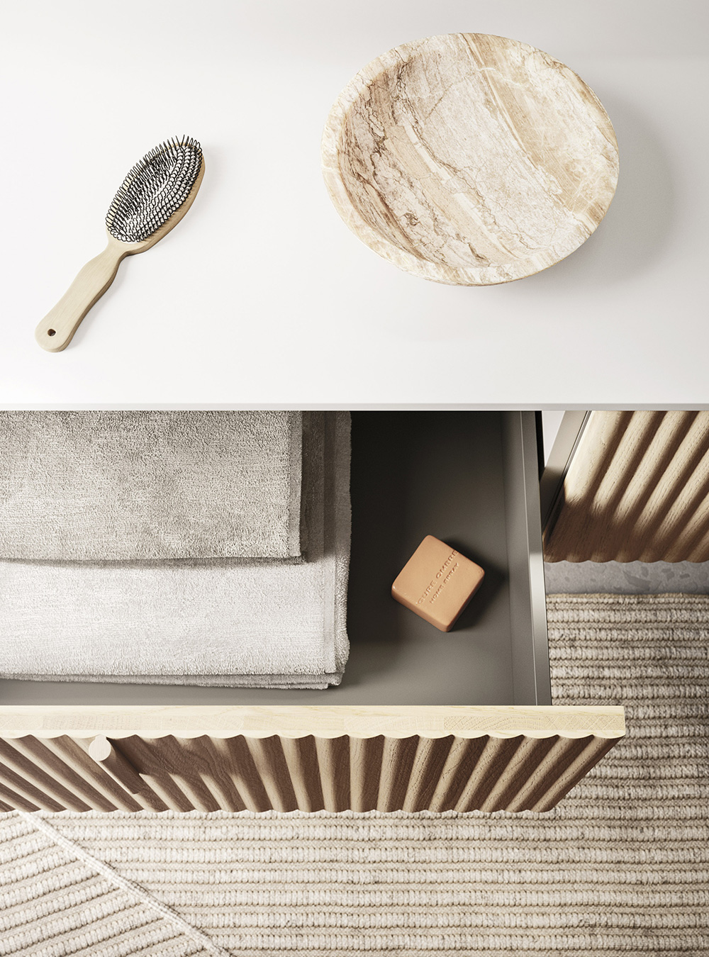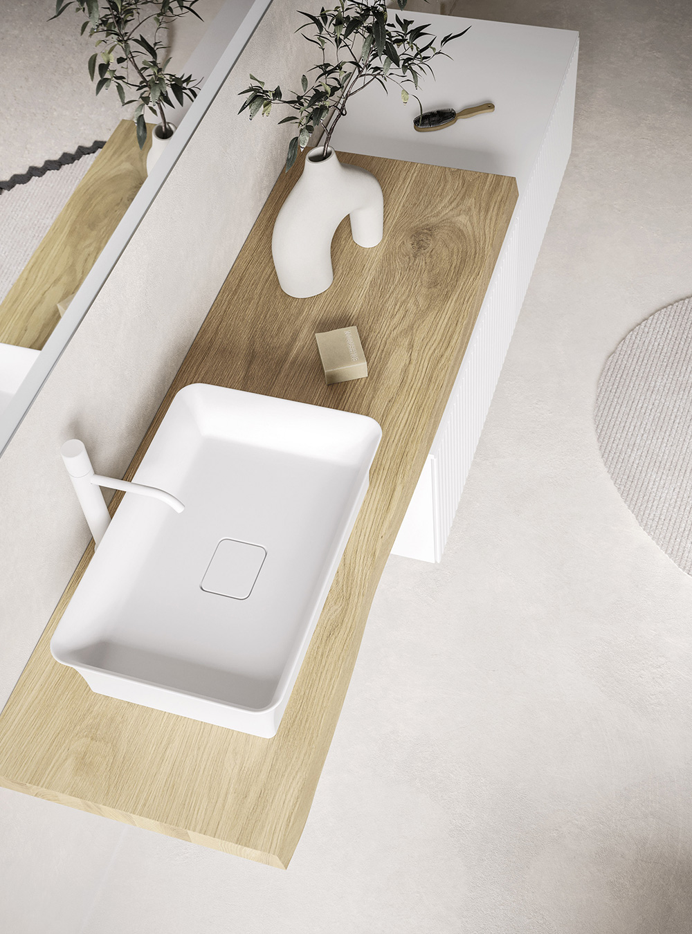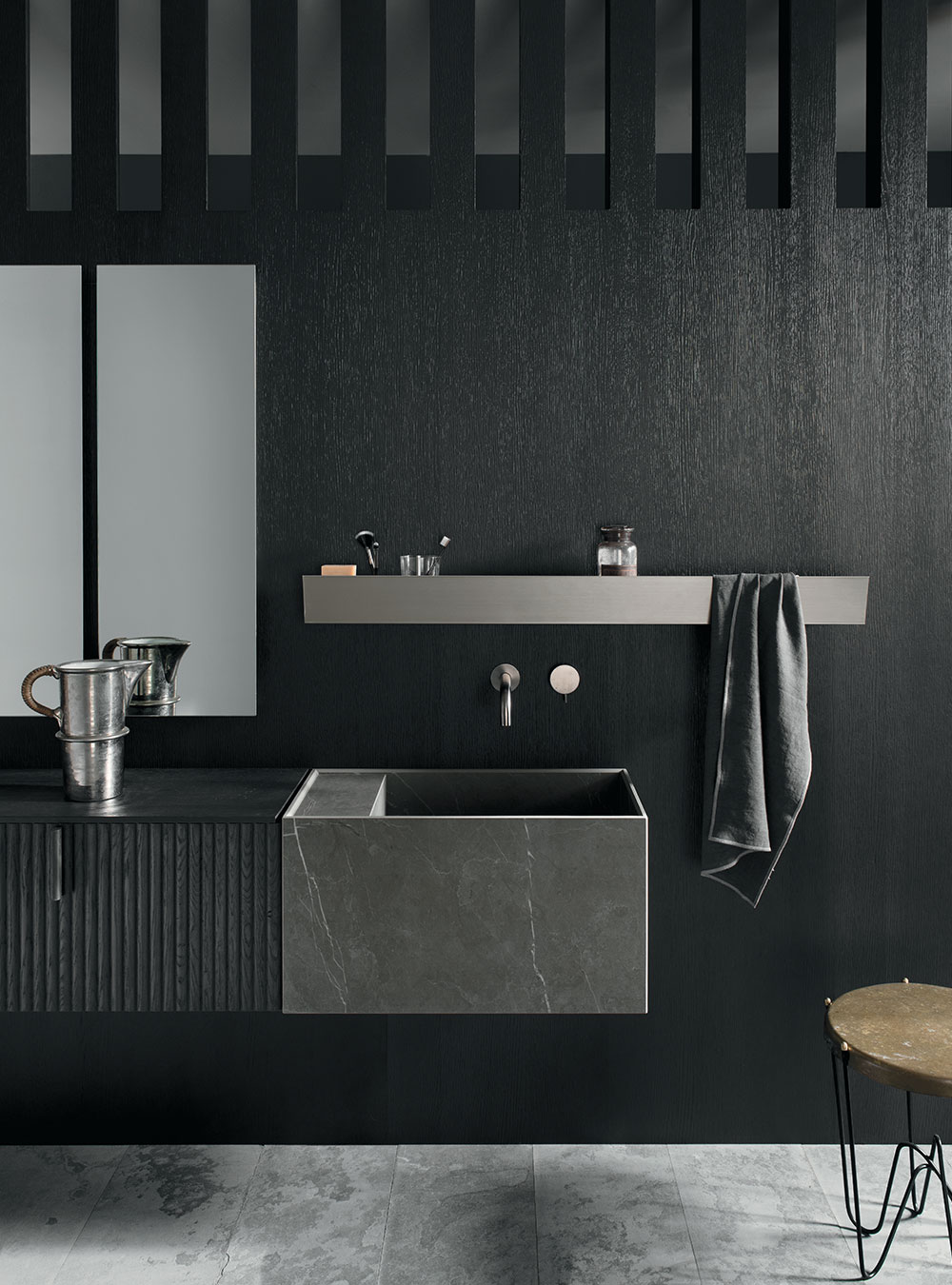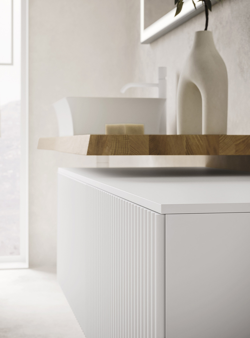 Code Wave: modularité et raffinement des matériaux pour meubles de salle de bain avec la particulière découpe à 45°