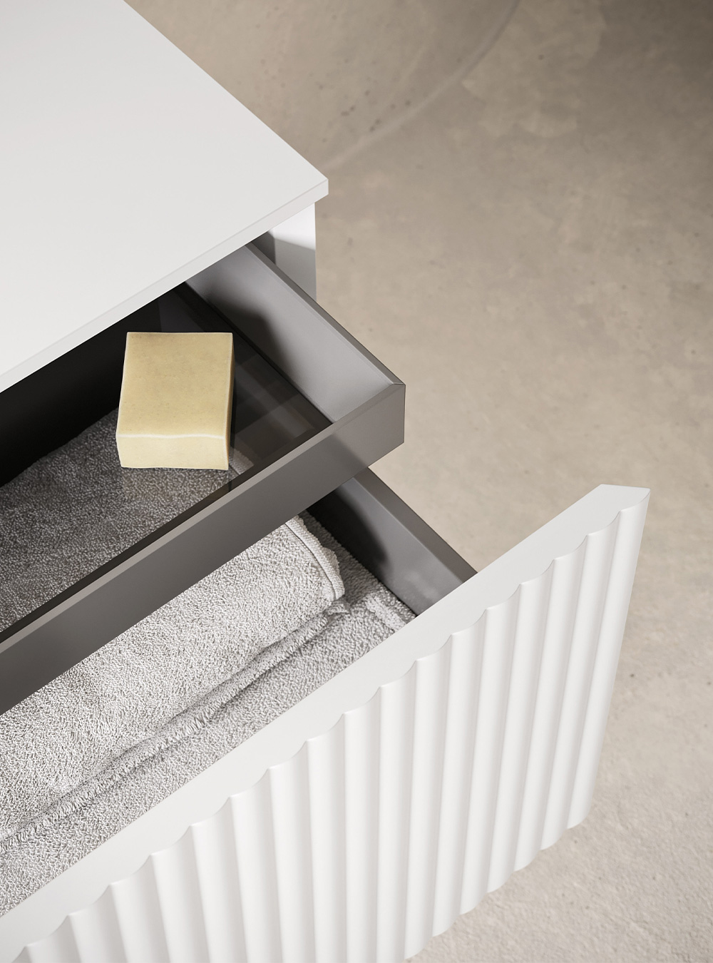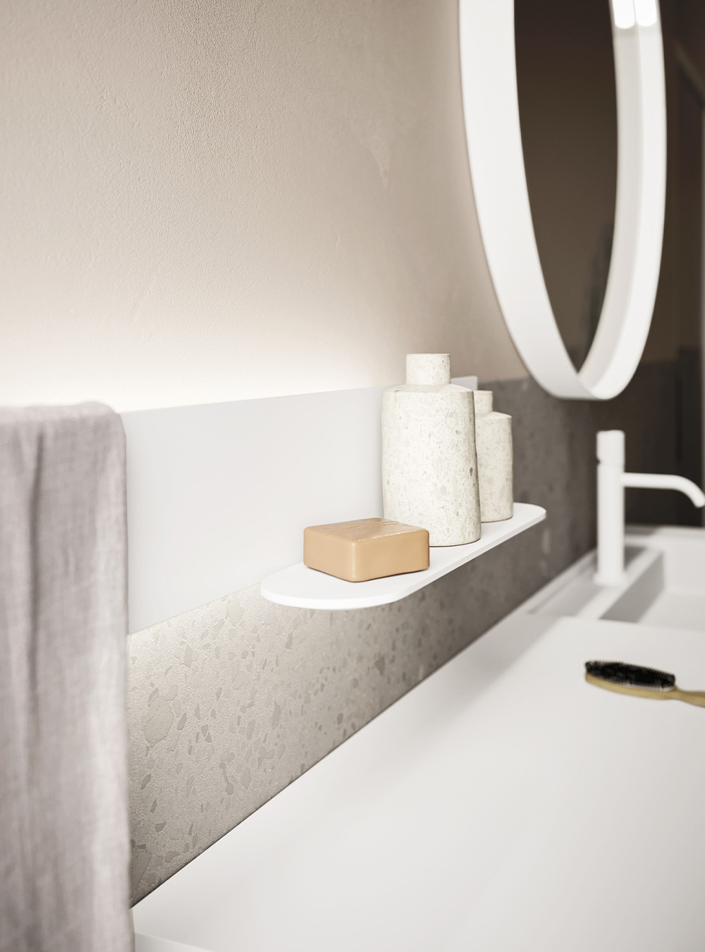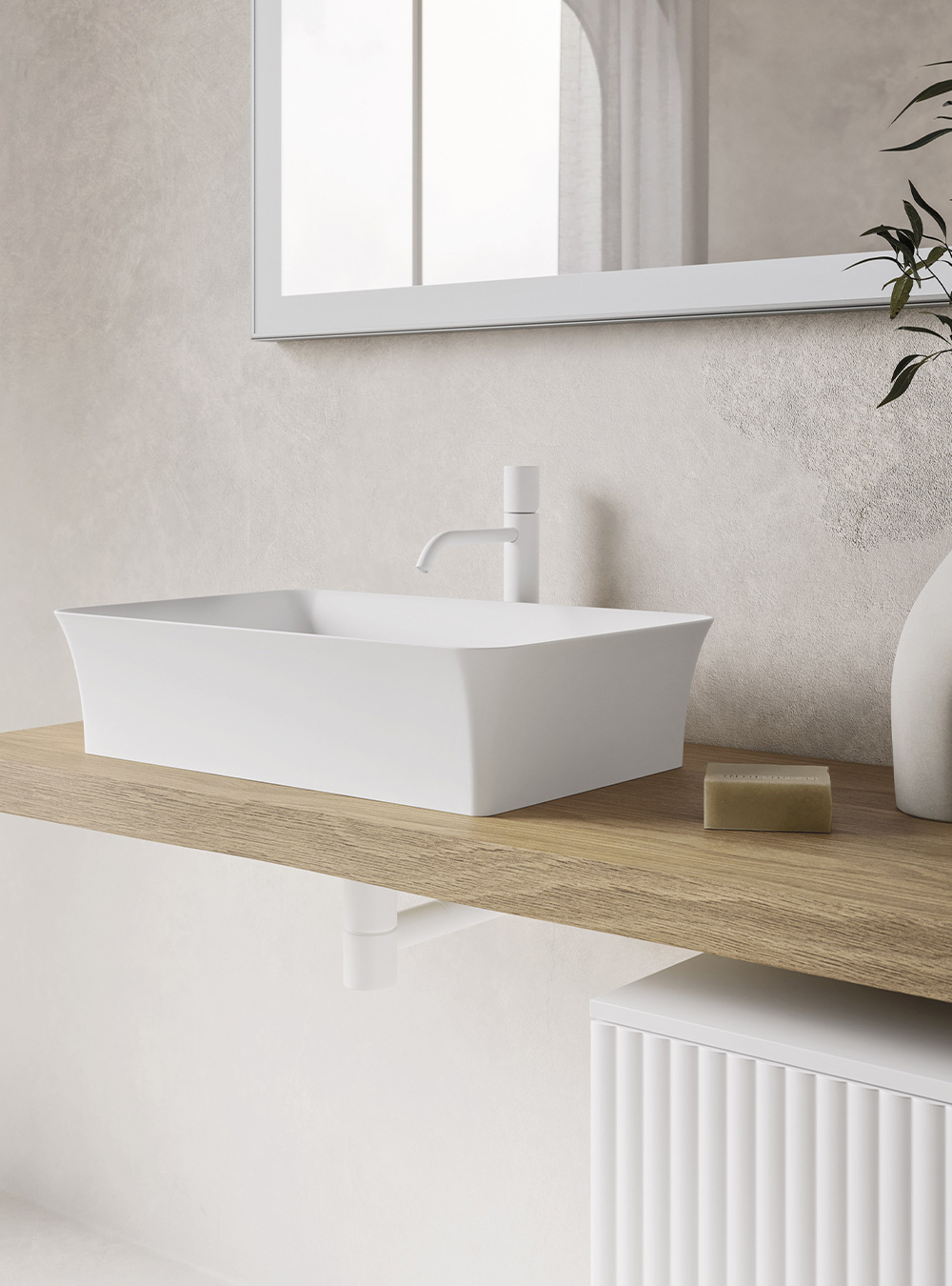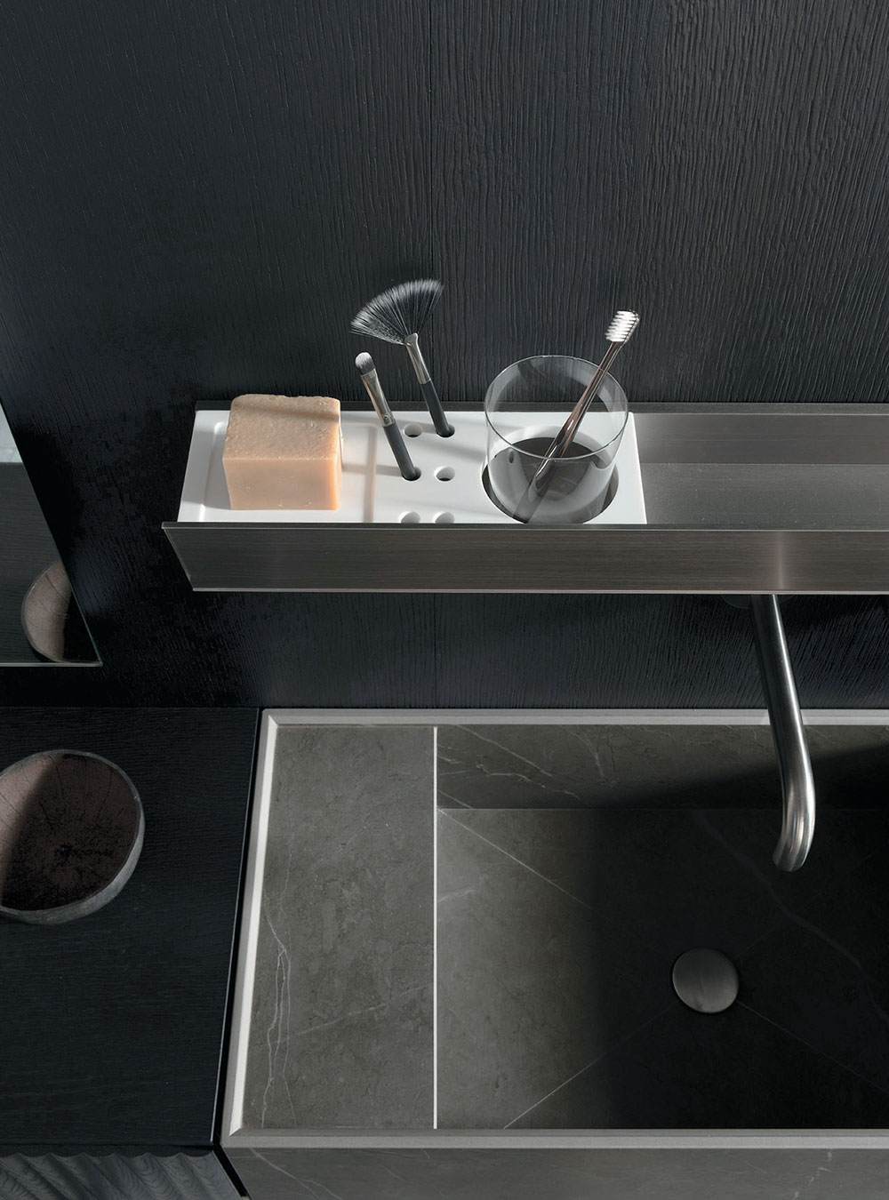 Code Wave: modularité et raffinement des matériaux pour meubles de salle de bain avec la particulière découpe à 45°