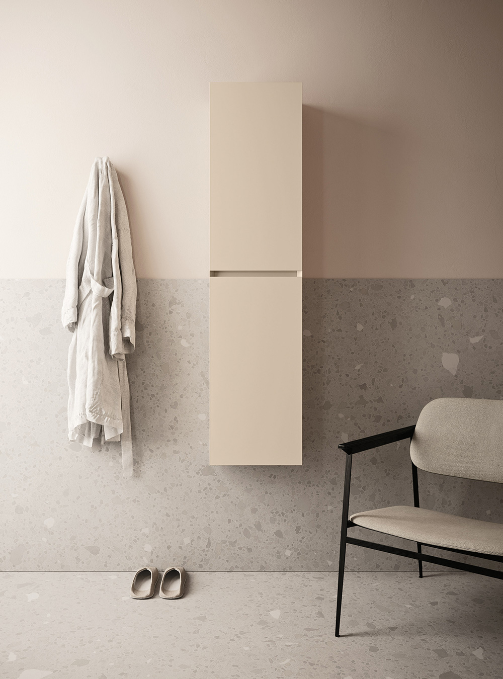 Code est une collection parfaitement alignée aux actuelles tendances de l’ameublement pour salle de bain et vise à créer des espaces ambiants avec une forte vocation au design et au bien-être. L’ample gamme de finitions disponibles, les éléments hauts et les consoles de tout type, unis à la vaste sélection de compléments, offrent un très haut niveau de personnalisation, en donnant naissance à des réalisations de couturier en mesure de satisfaire toute exigence d’ameublement. Avec prise pour poignée intégrée et découpe caractéristique à 45° sur côtés et façades, Code se distingue pour sa modularité et le raffinement des matériaux qui permettent de créer des juxtapositions de finitions différentes telles que chêne, eucalyptus et laqué mat or velvet.