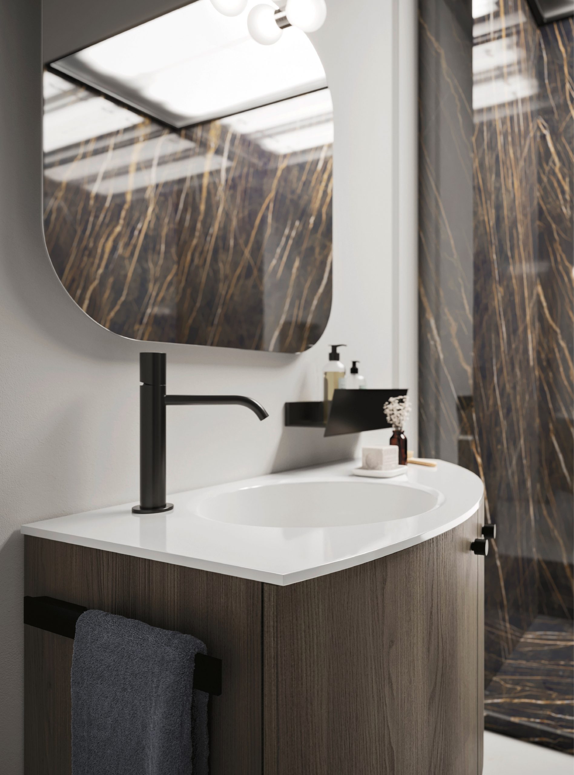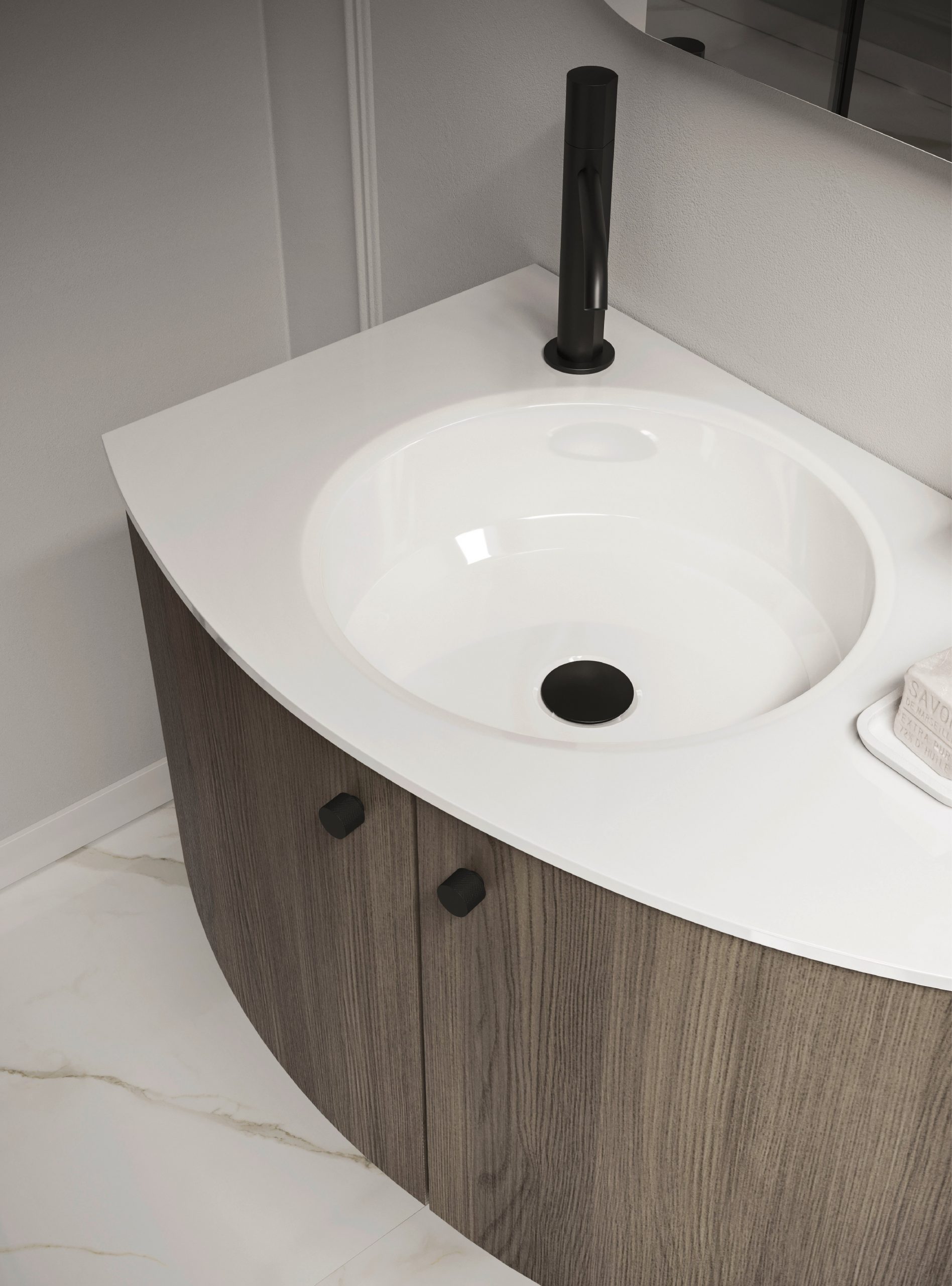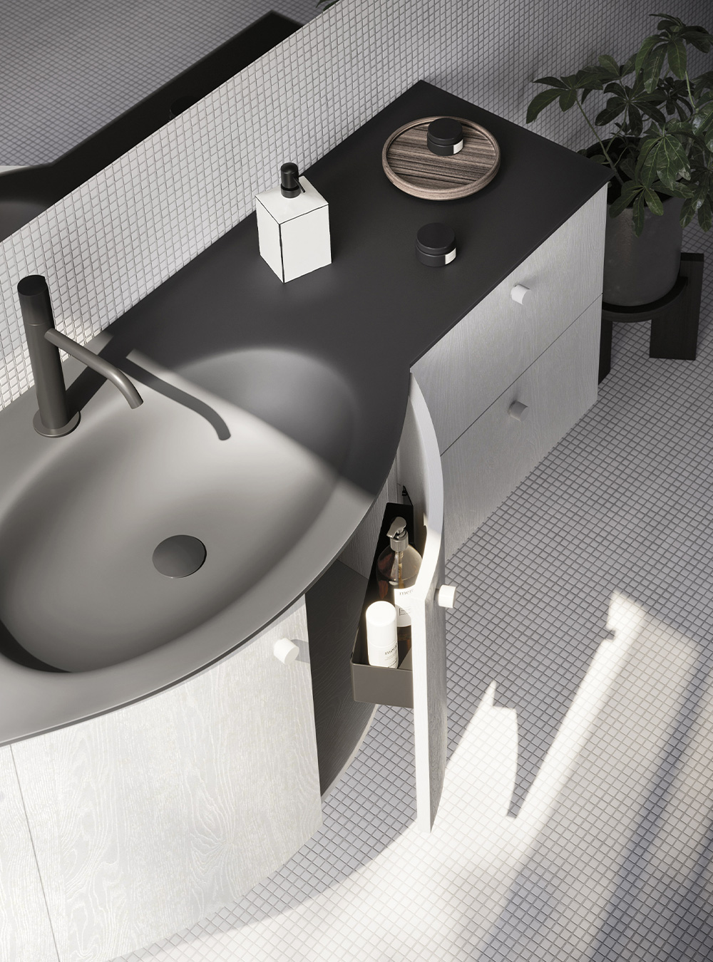Ho.Me Plus est une collection innovante d’Arbi Arredobagno qui rassemble une large gamme de finitions en mélaminé thermostructuré avec des veines naturelles, des couleurs classiques ou tendance. La collection est disponible en deux variantes : l’une avec façade plate et poignée, l’autre avec la prise de main en « J » intégrée. Caracterisée par une grande modularité, grâce au choix entre trois profondeurs et différentes largeurs, la collection s’enrichit de la version courbée, qui propose des bases aux lignes douces pour satisfaire même les besoins d’optimisation des espaces les plus réduits.