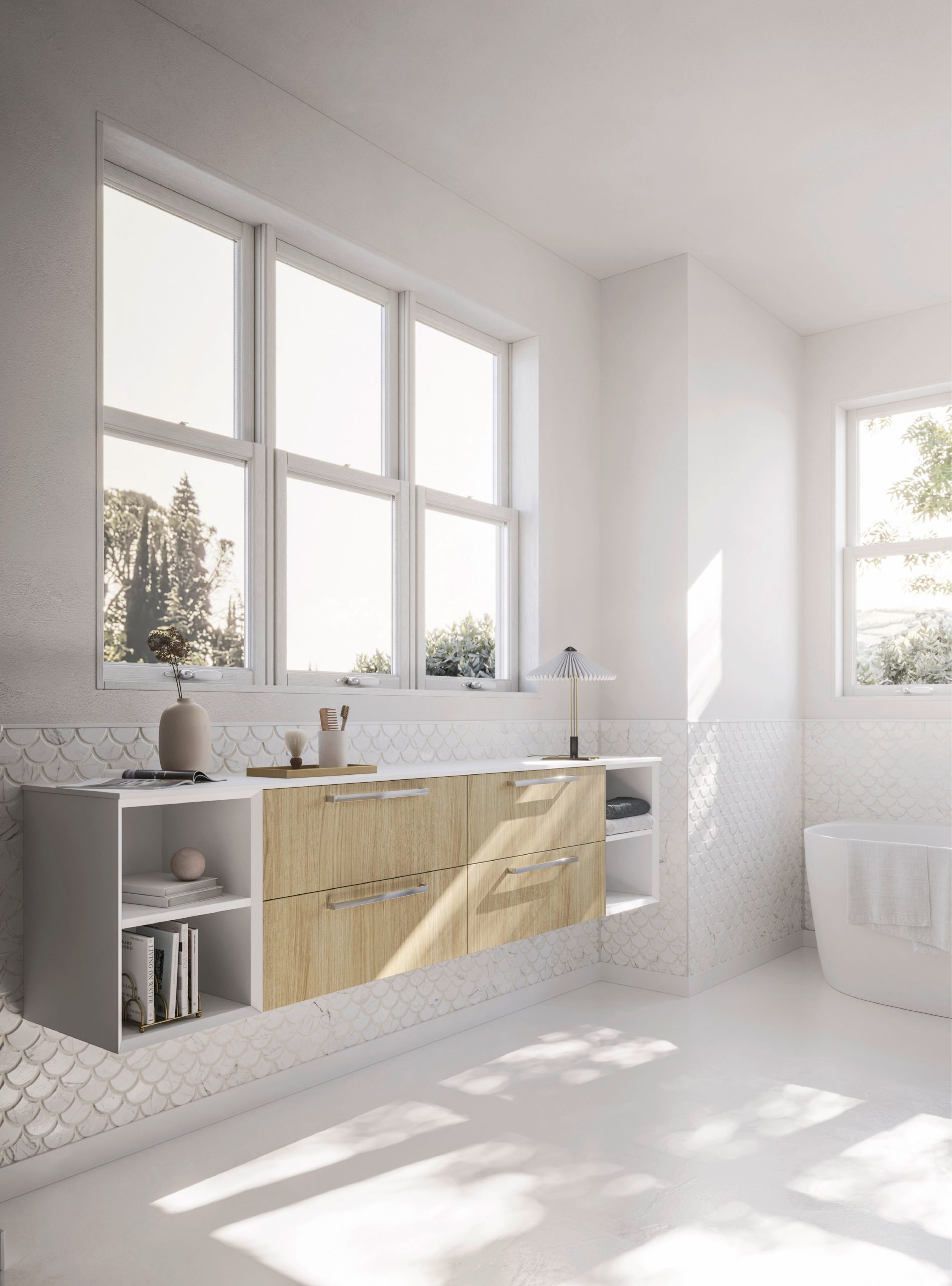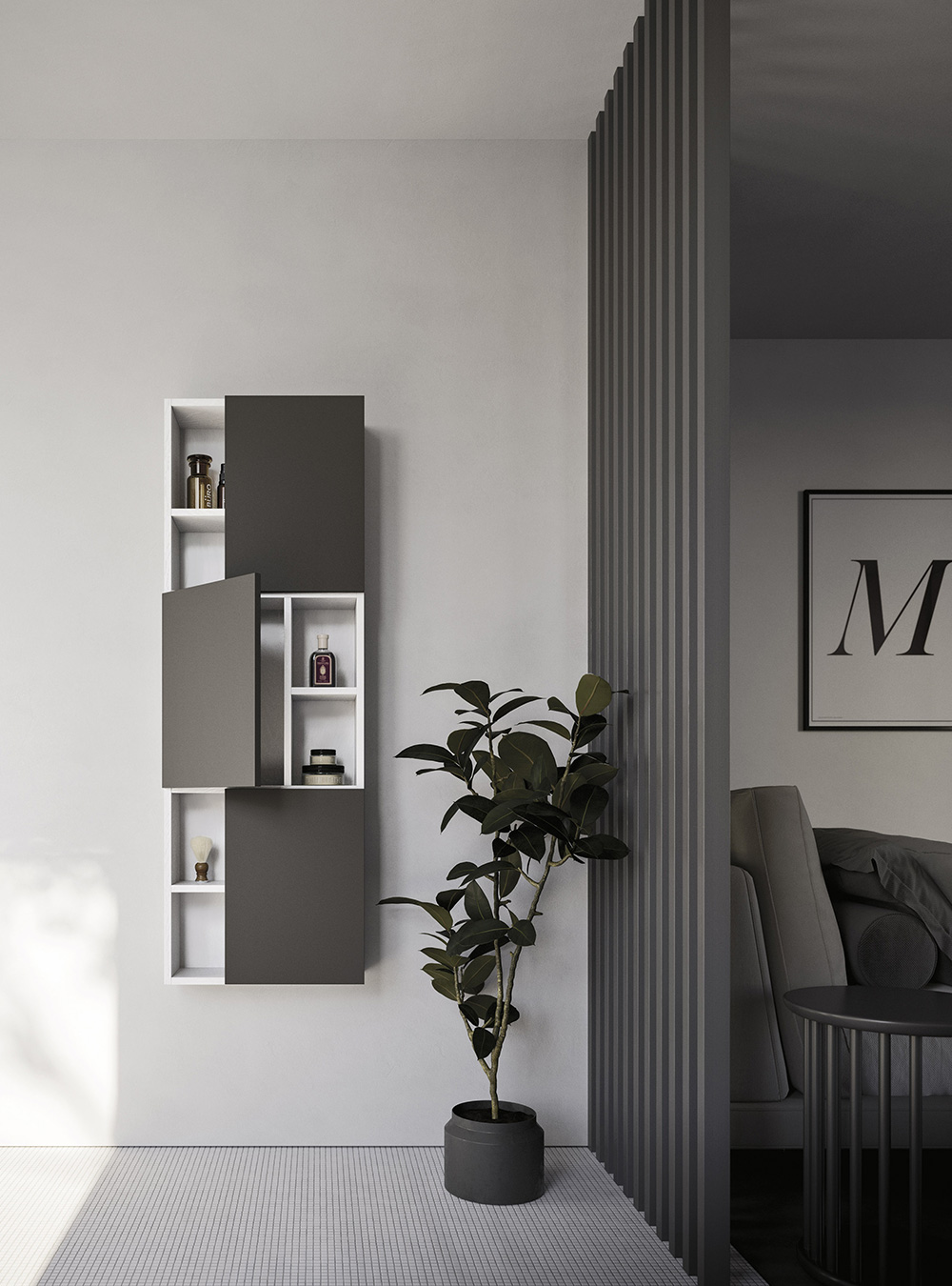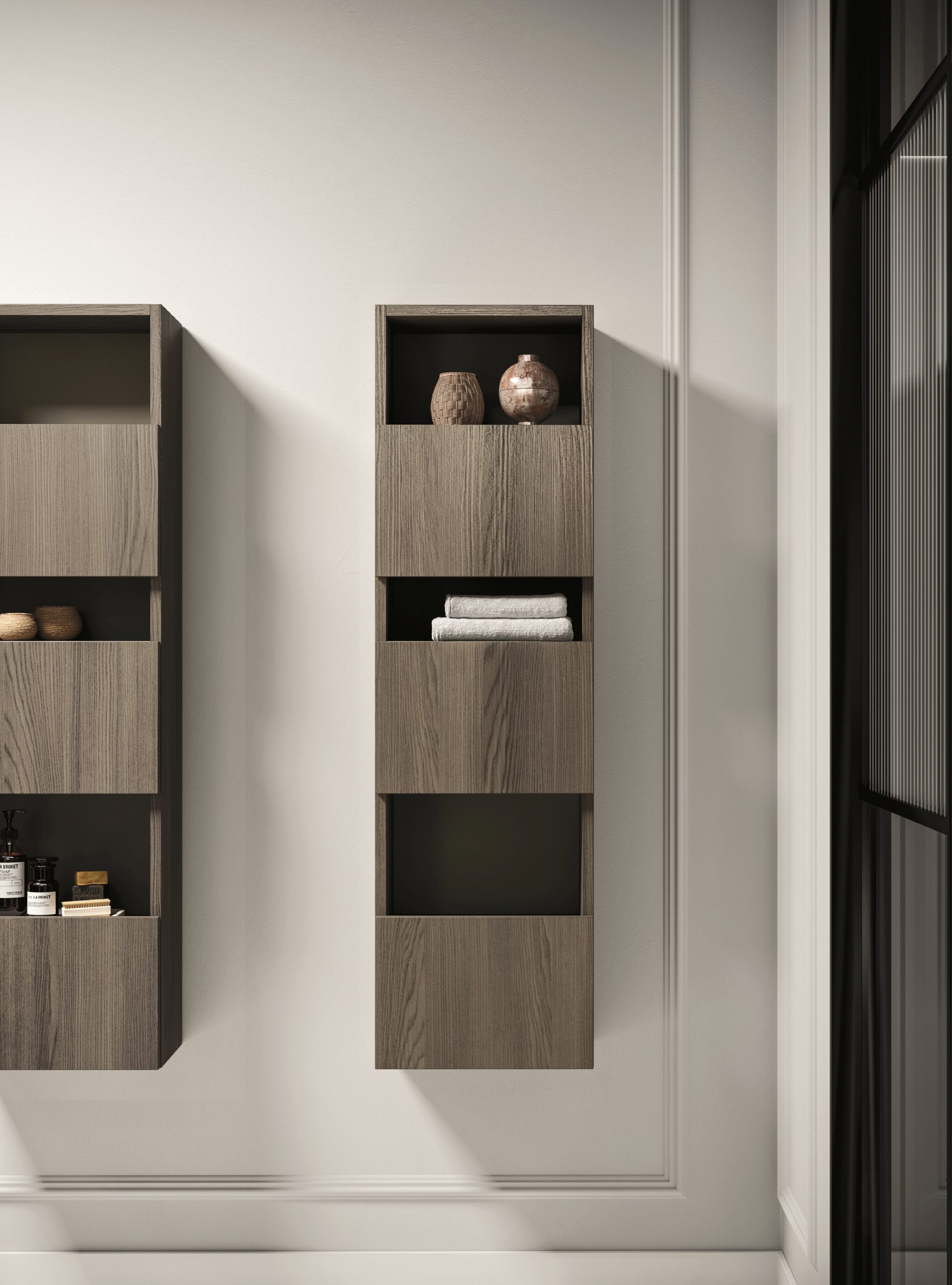Ho.Me Plus est une collection innovante d’Arbi Arredobagno qui rassemble une large gamme de finitions en mélaminé thermostructuré avec des veines naturelles, des couleurs classiques ou tendance. La collection est disponible en deux variantes : l’une avec façade plate et poignée, l’autre avec la prise de main en « J » intégrée. Caracterisée par une grande modularité, grâce au choix entre trois profondeurs et différentes largeurs, la collection s’enrichit de la version courbée, qui propose des bases aux lignes douces pour satisfaire même les besoins d’optimisation des espaces les plus réduits.