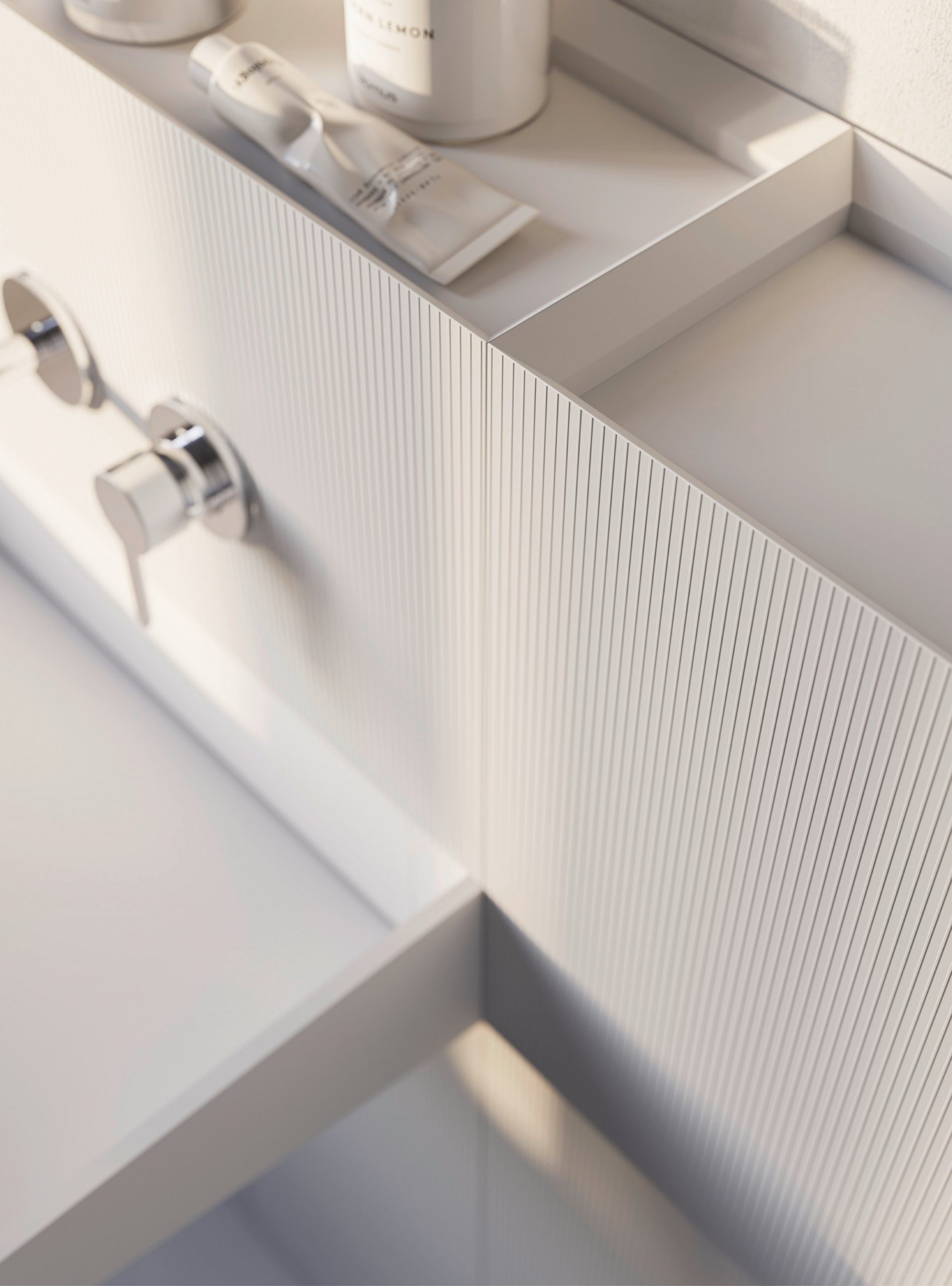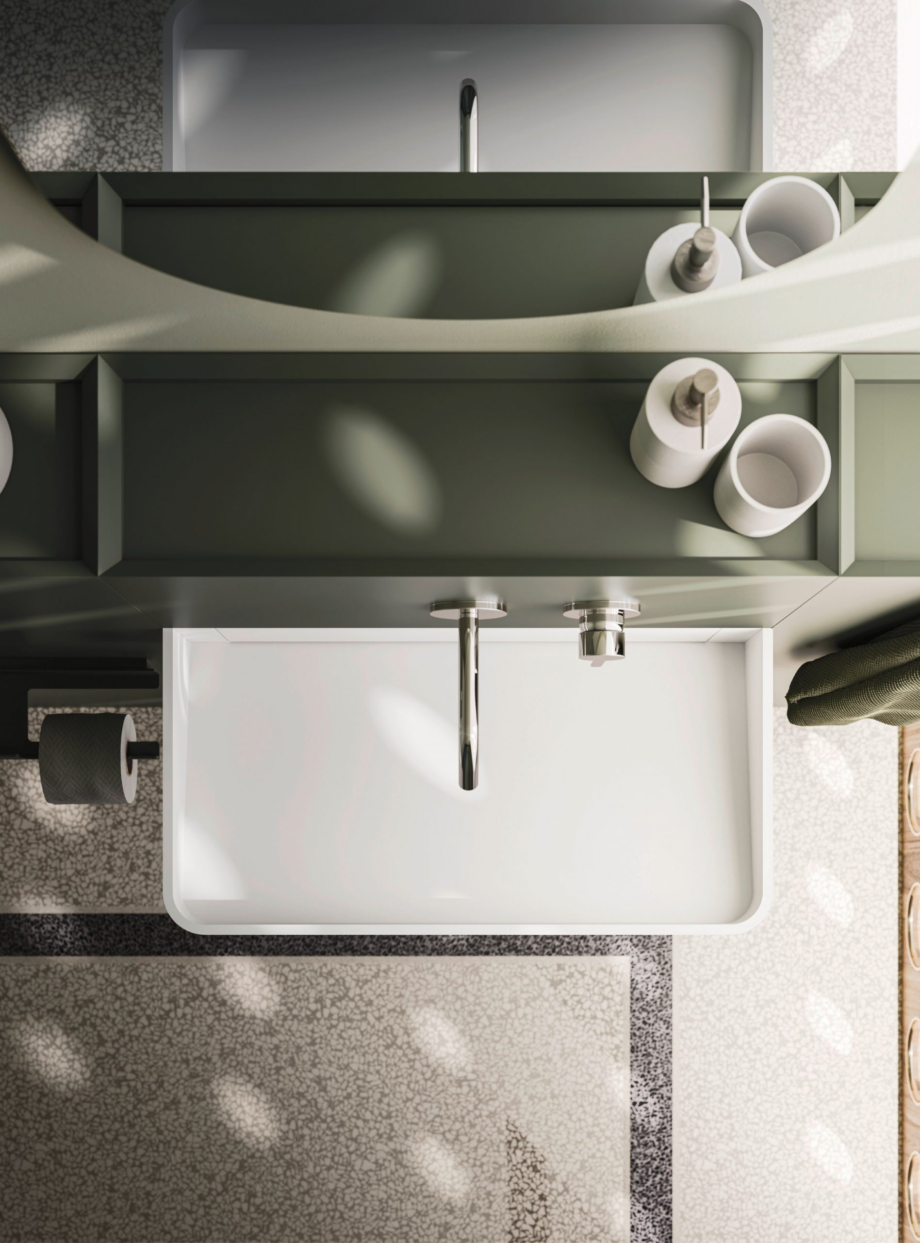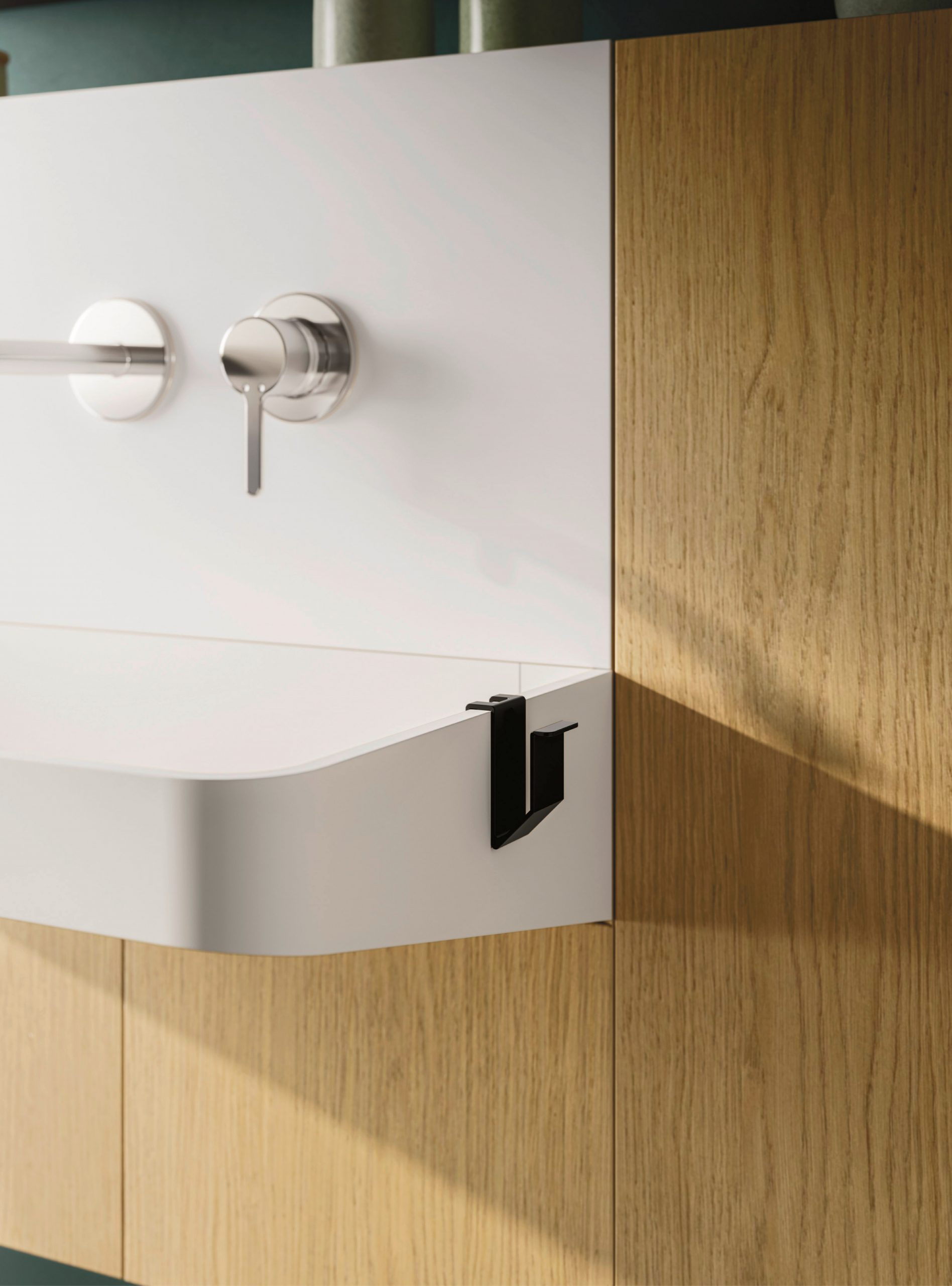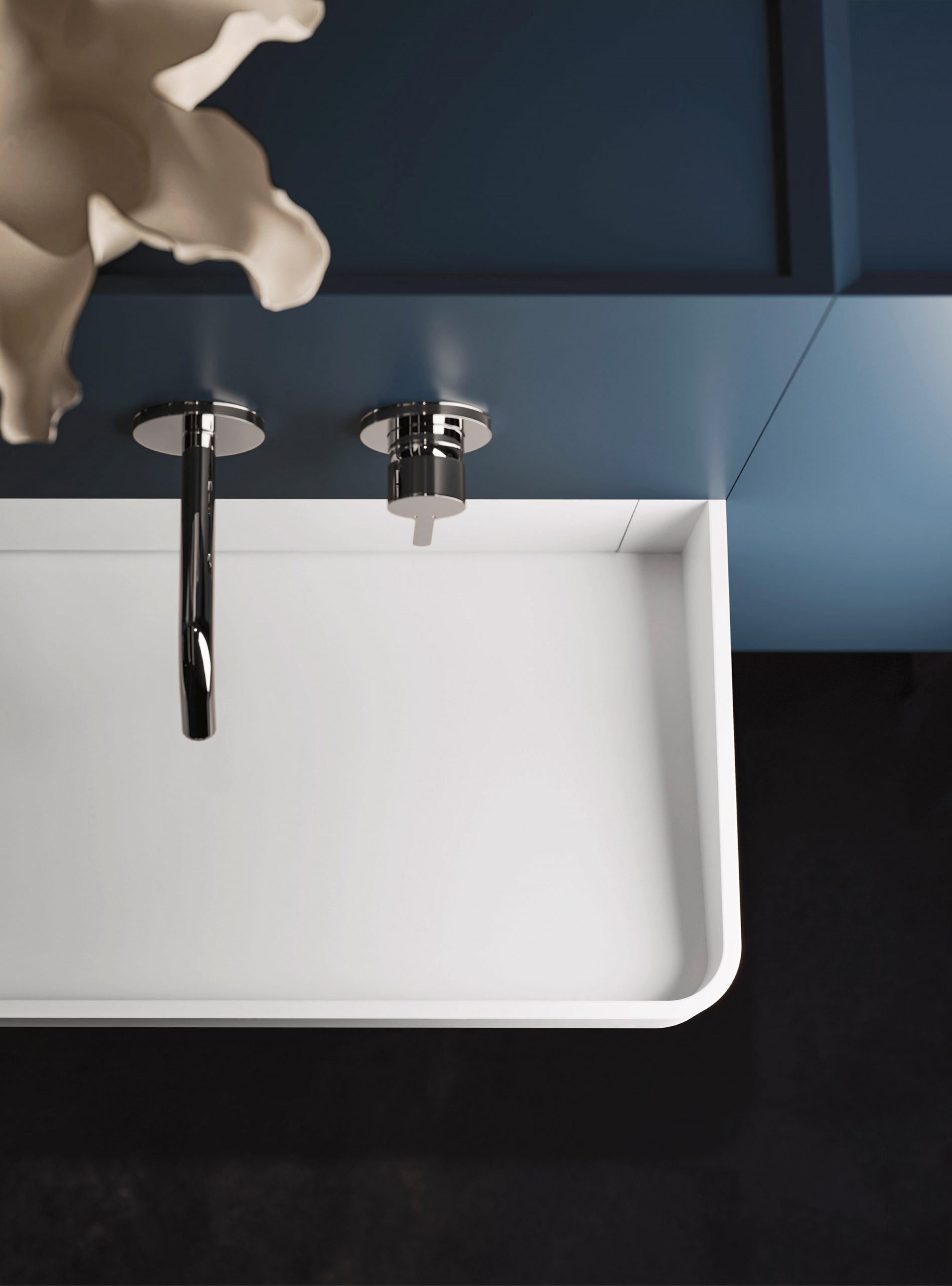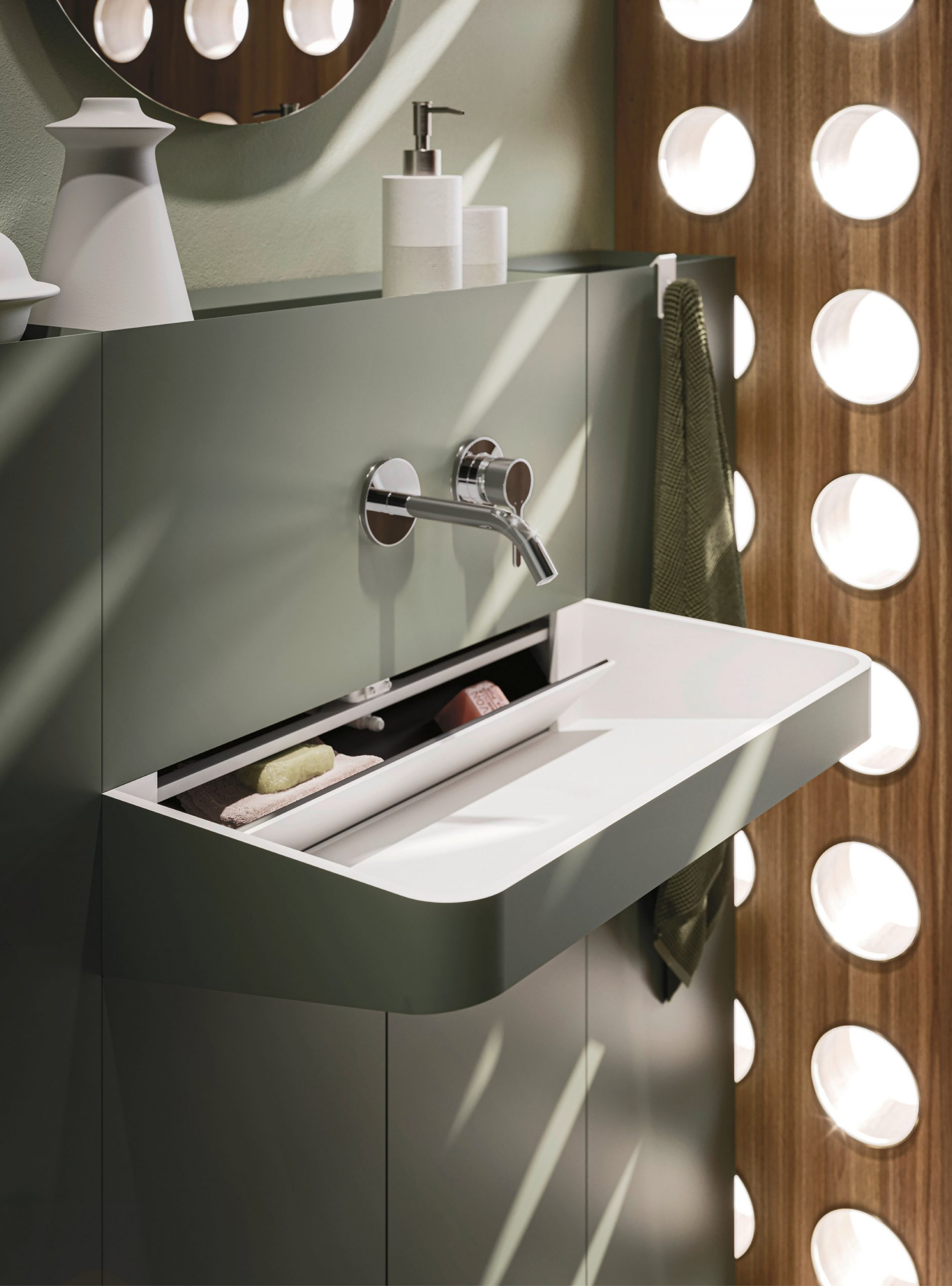 Le lavabo Over, réalisé en Ocritech blanc ou laqué extérieurement de la même couleur que le meuble, est équipé d’un panneau push-pull amovible pour faciliter le nettoyage quotidien et d’un petit bac.