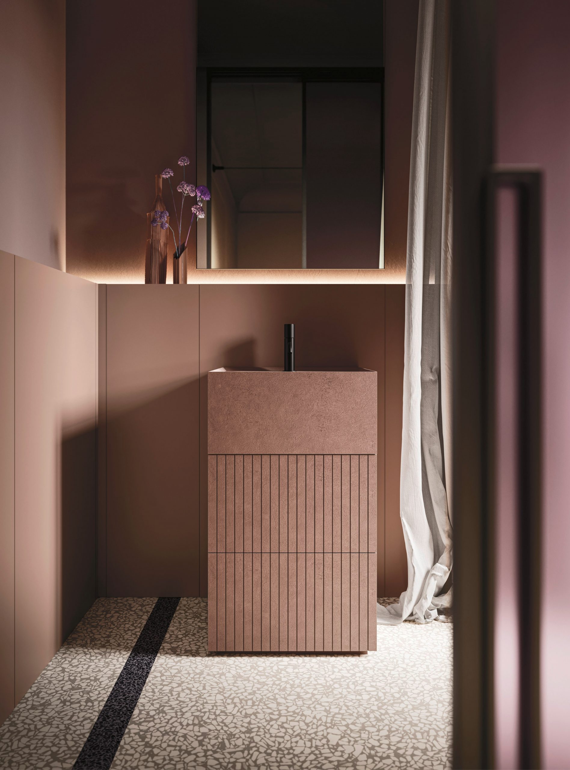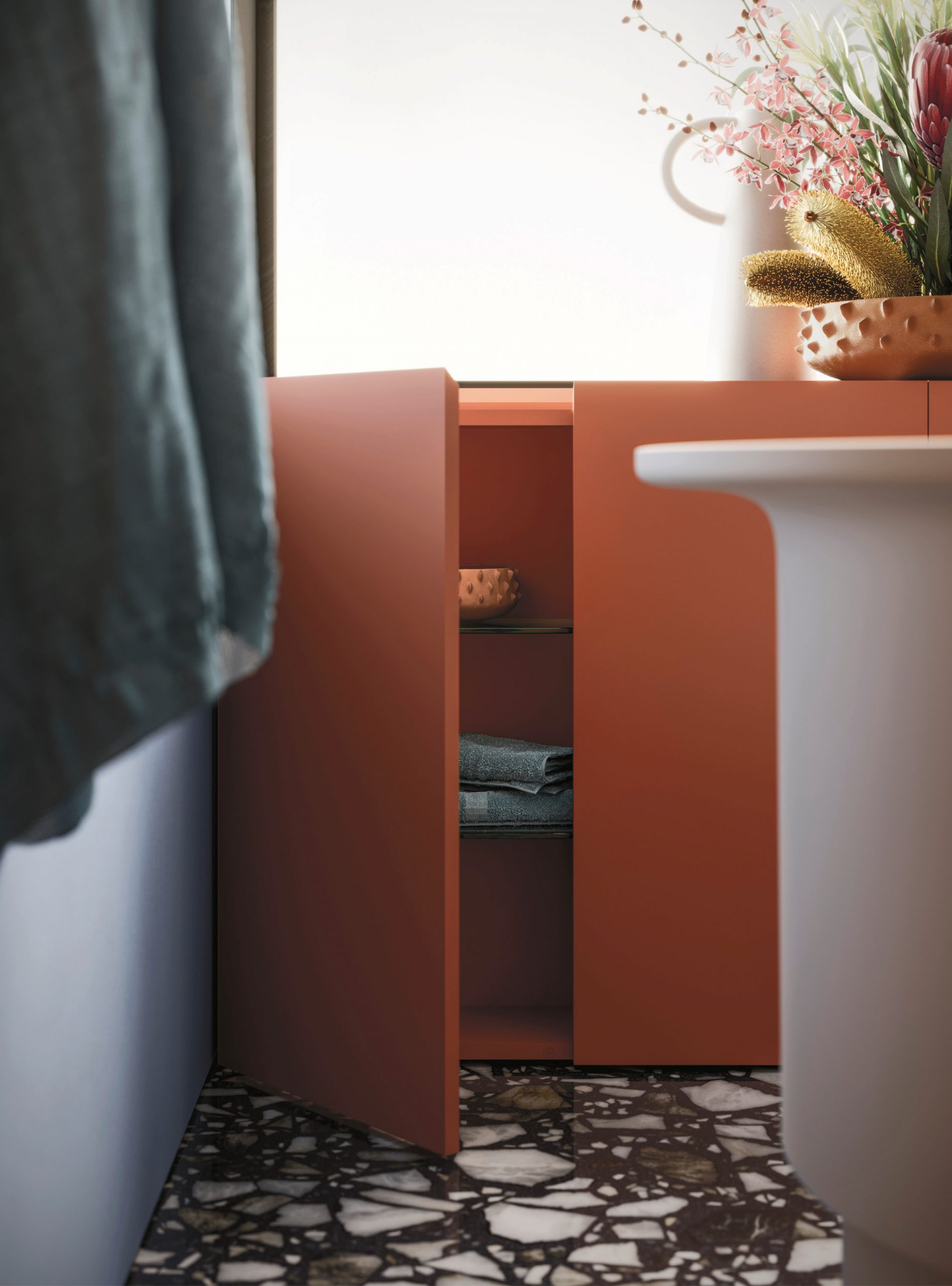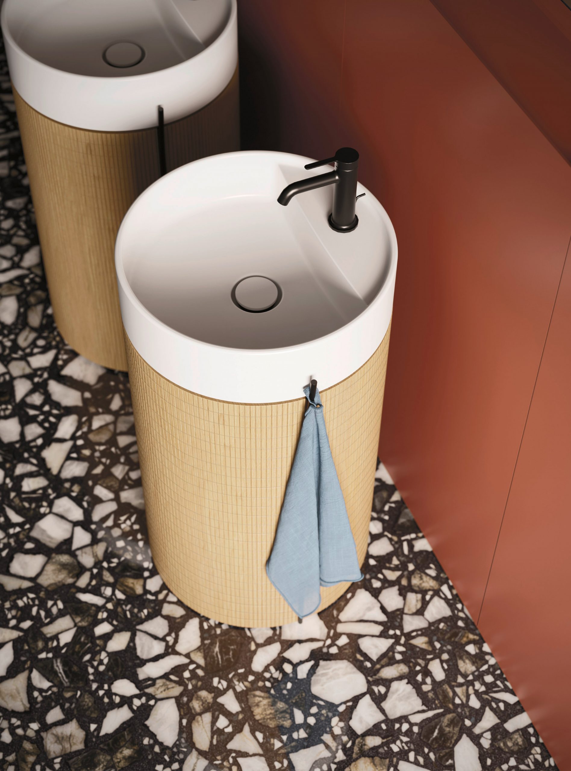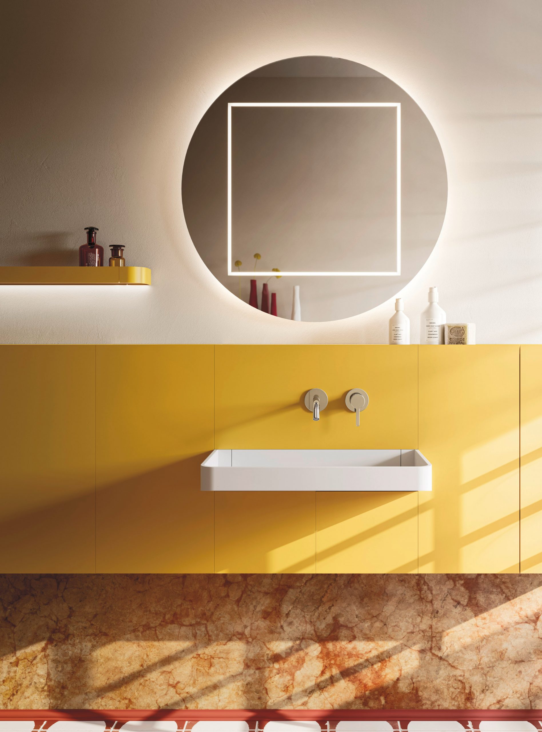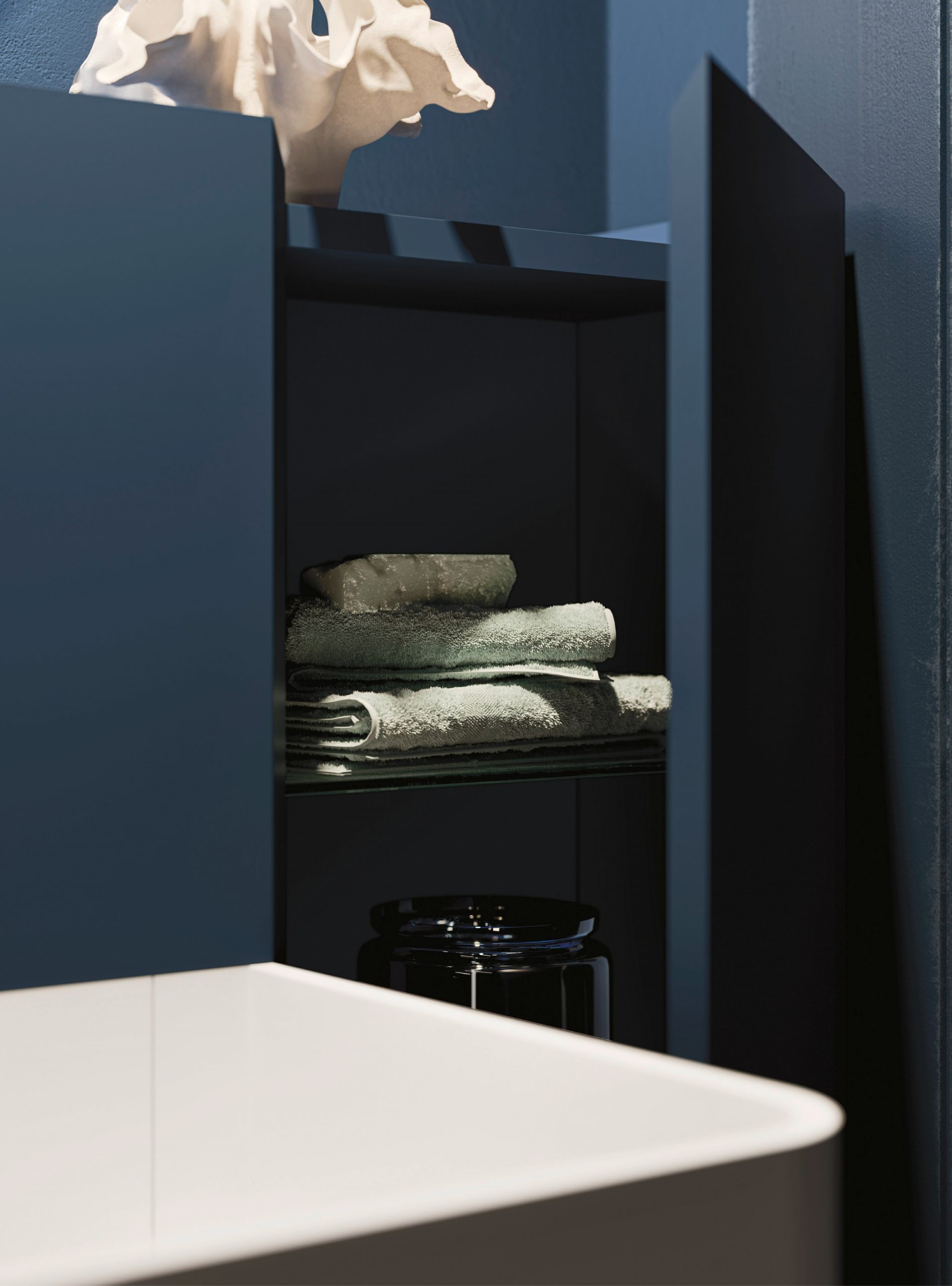 Le lavabo Over, réalisé en Ocritech blanc ou laqué extérieurement de la même couleur que le meuble, est équipé d’un panneau push-pull amovible pour faciliter le nettoyage quotidien et d’un petit bac.