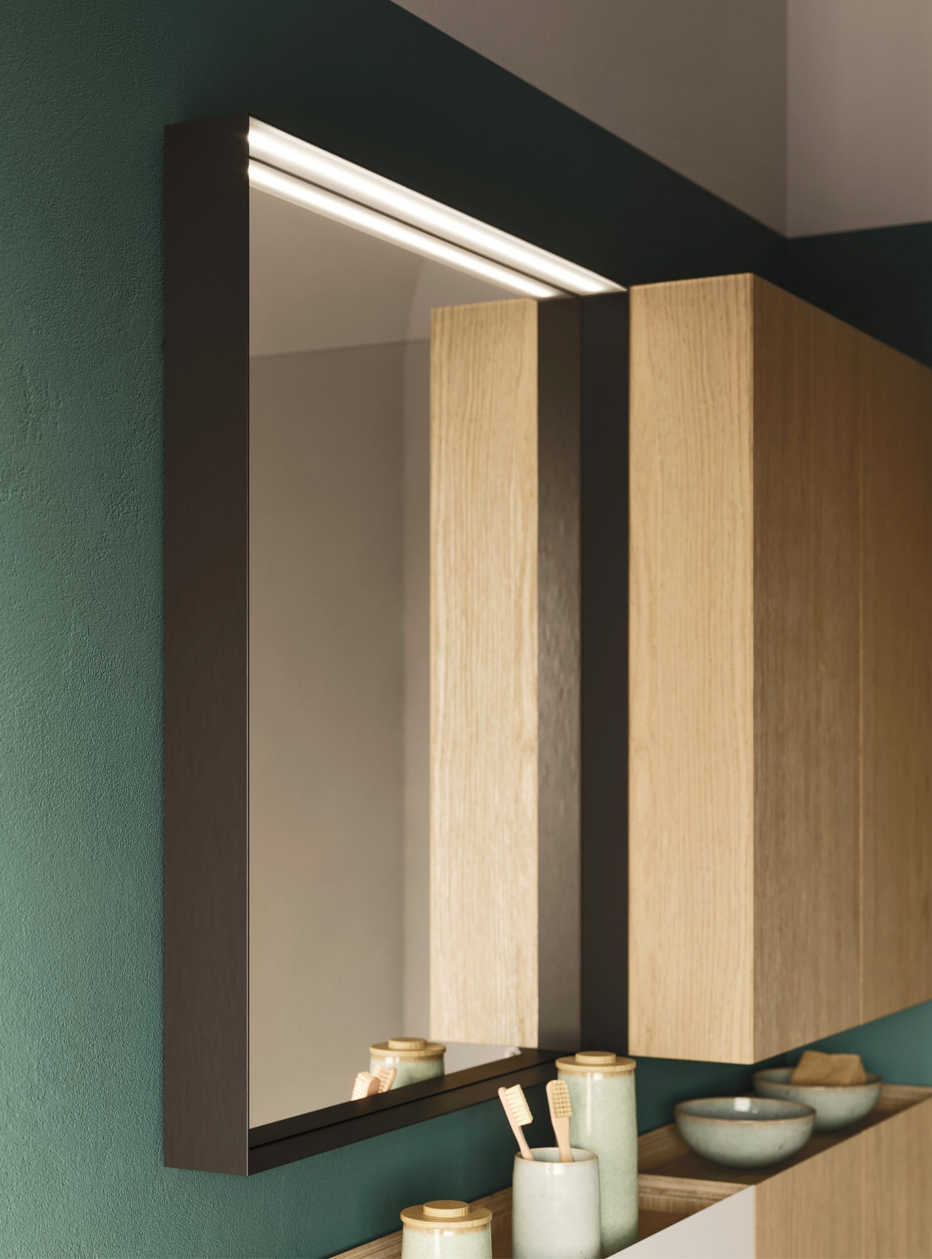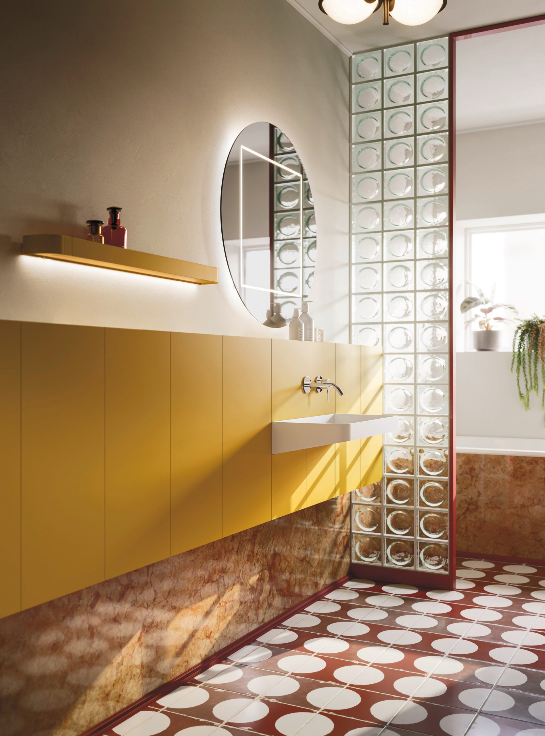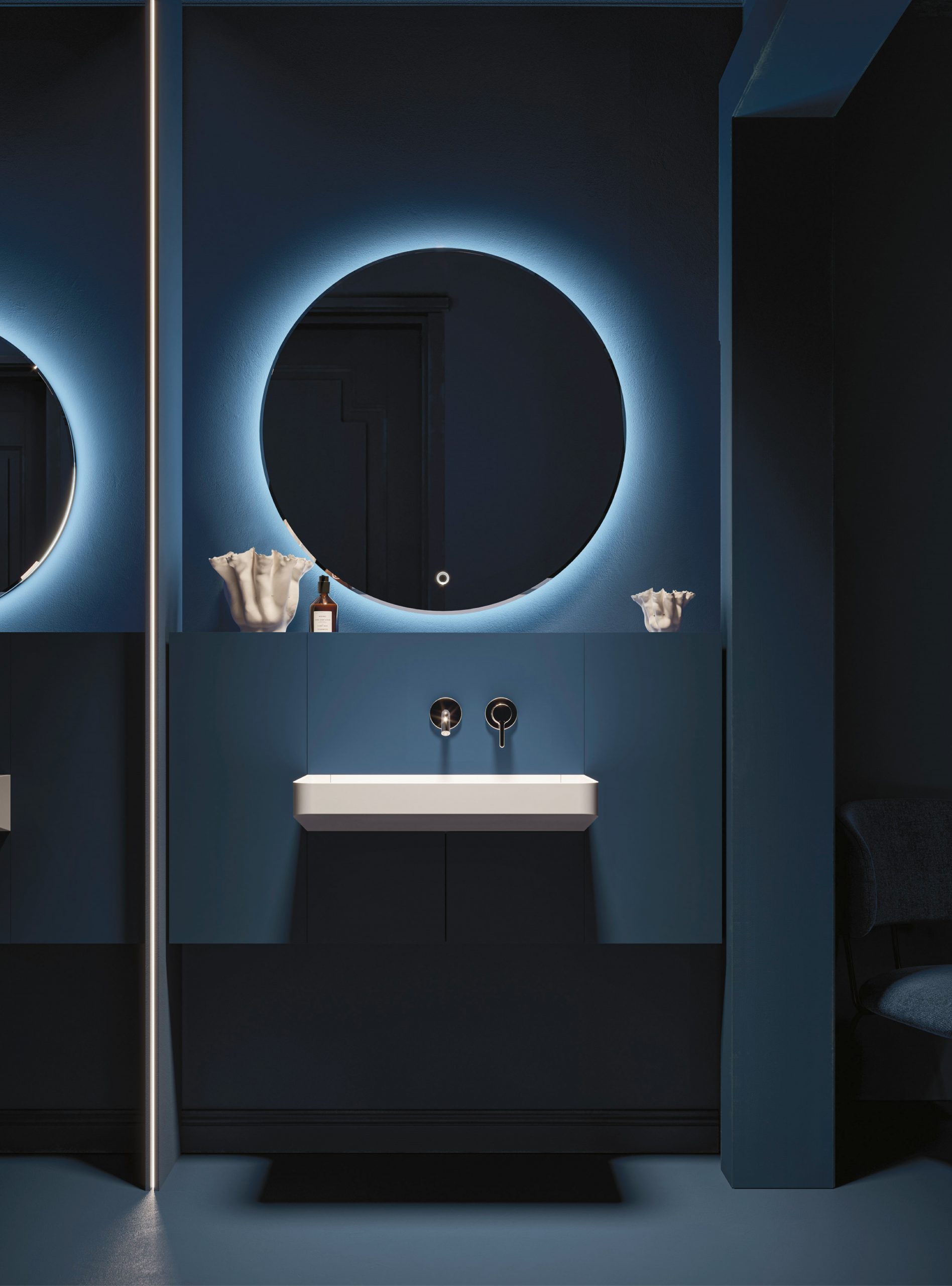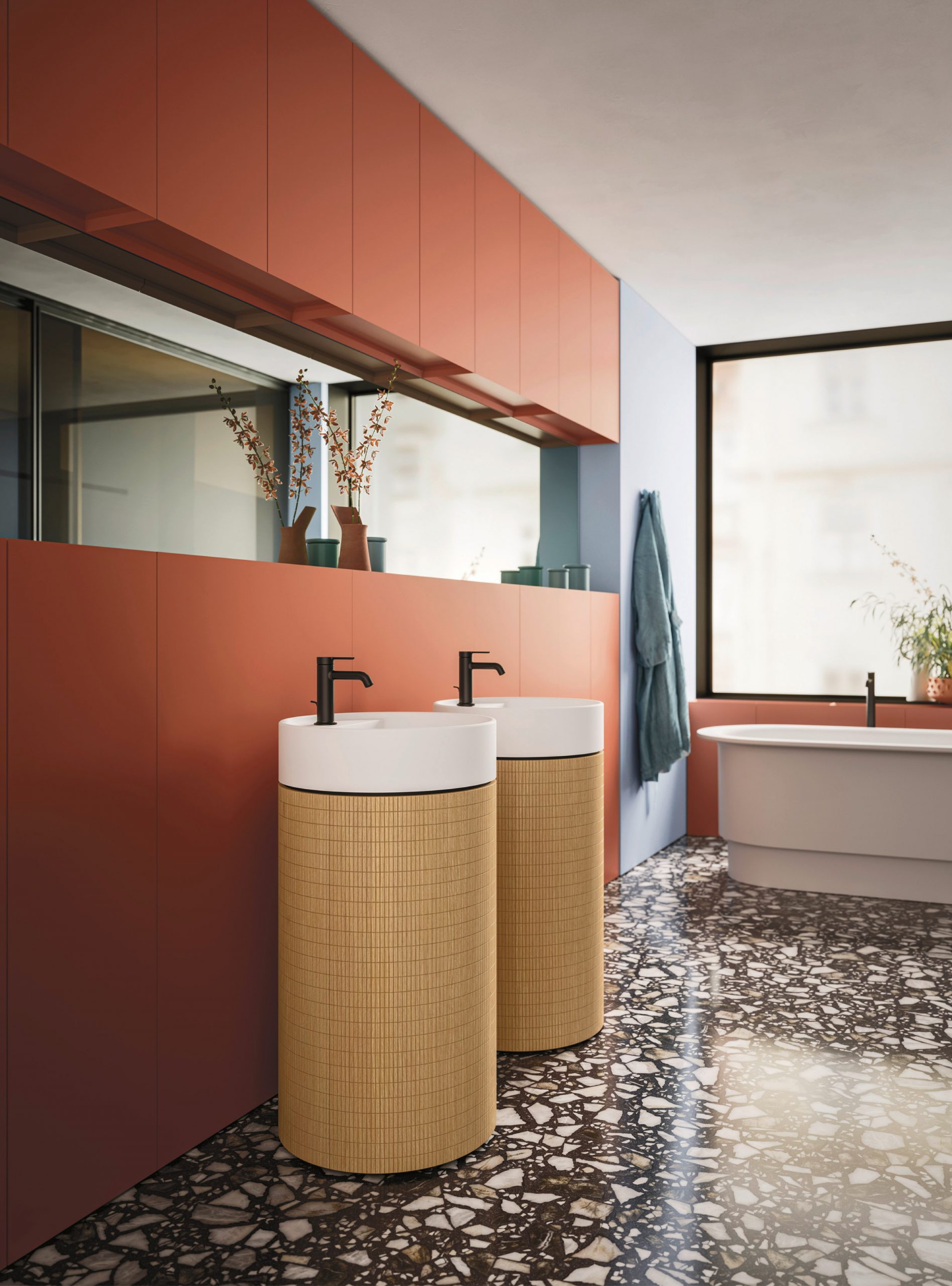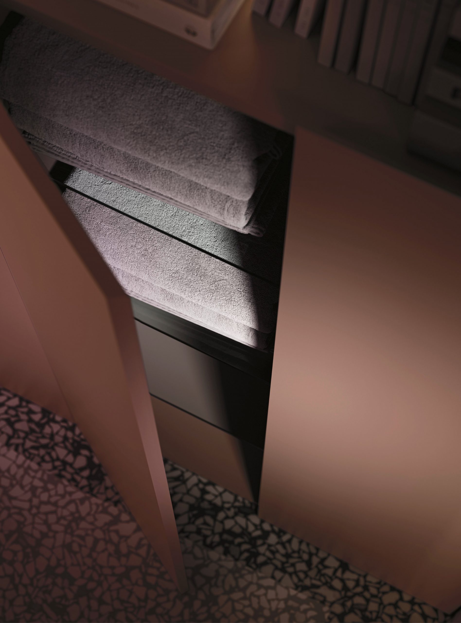 Le lavabo Over, réalisé en Ocritech blanc ou laqué extérieurement de la même couleur que le meuble, est équipé d’un panneau push-pull amovible pour faciliter le nettoyage quotidien et d’un petit bac.