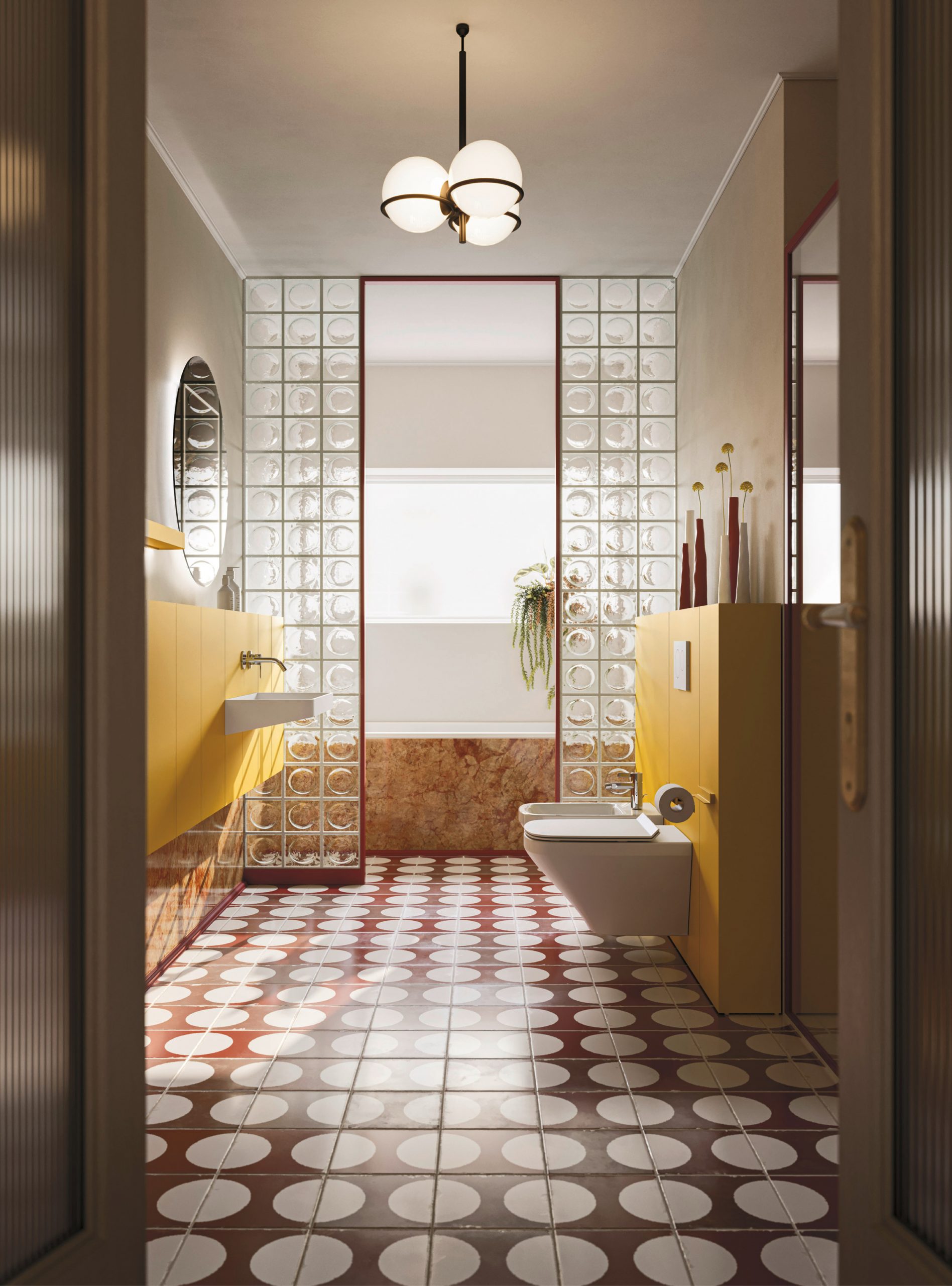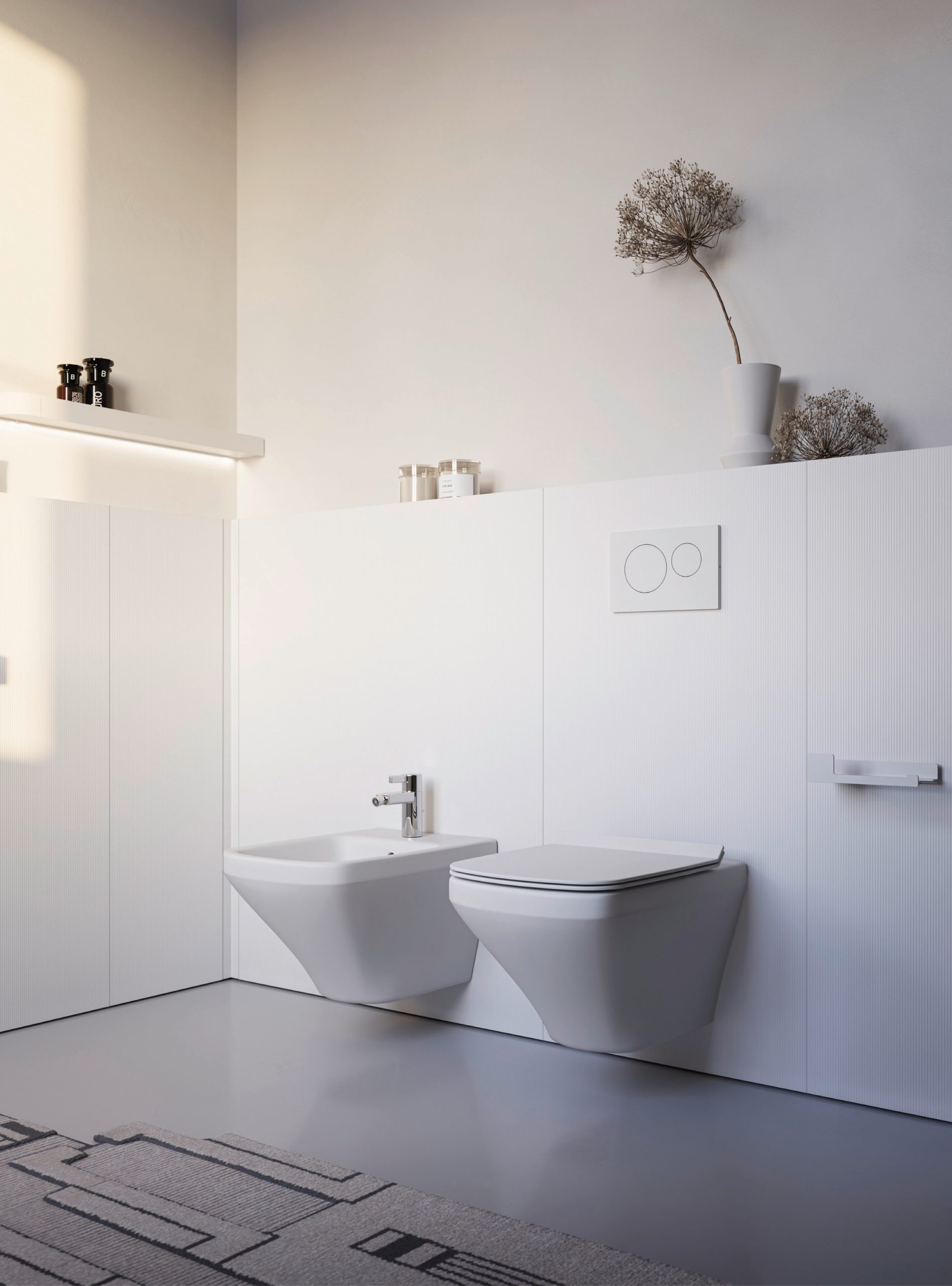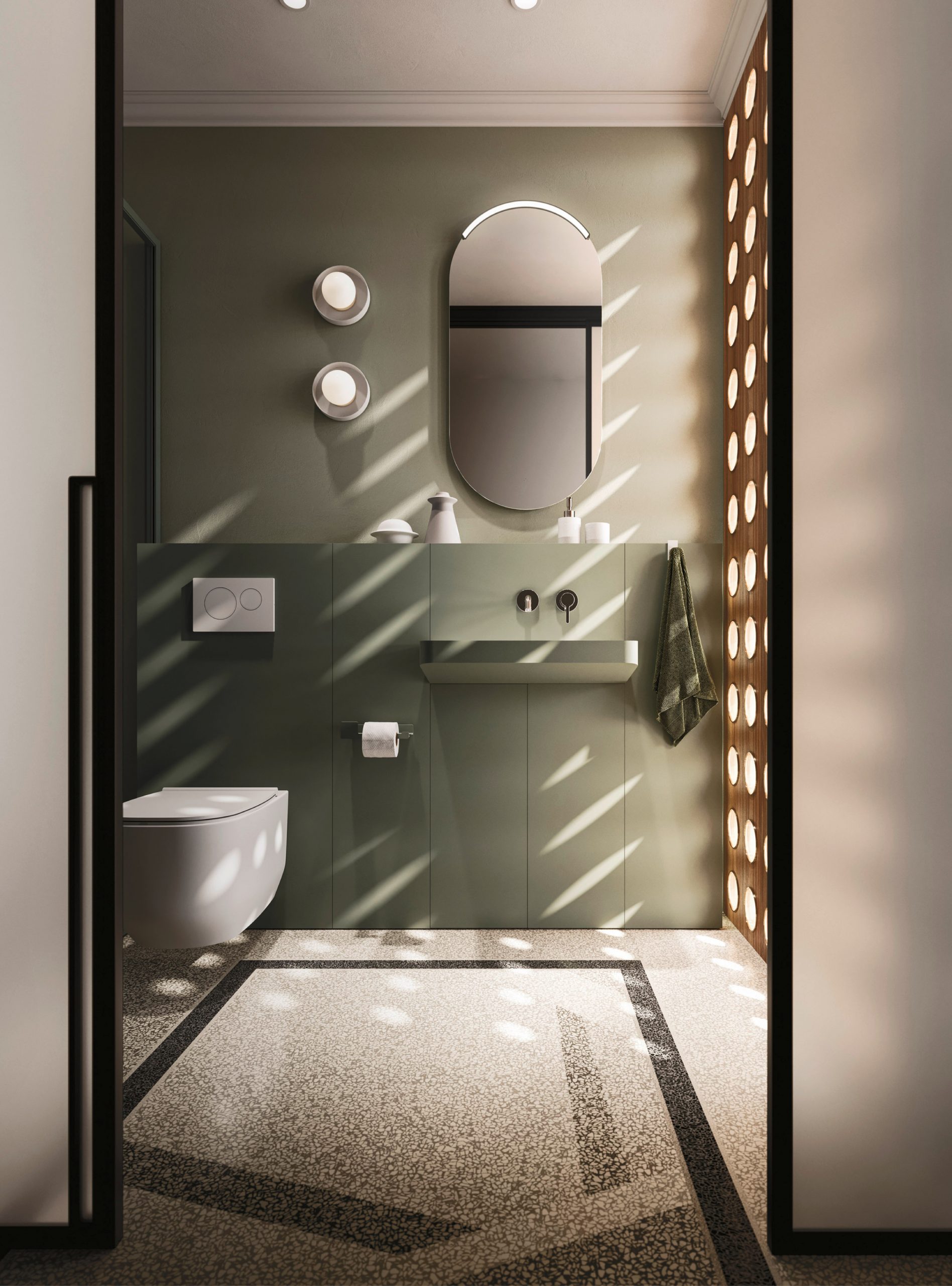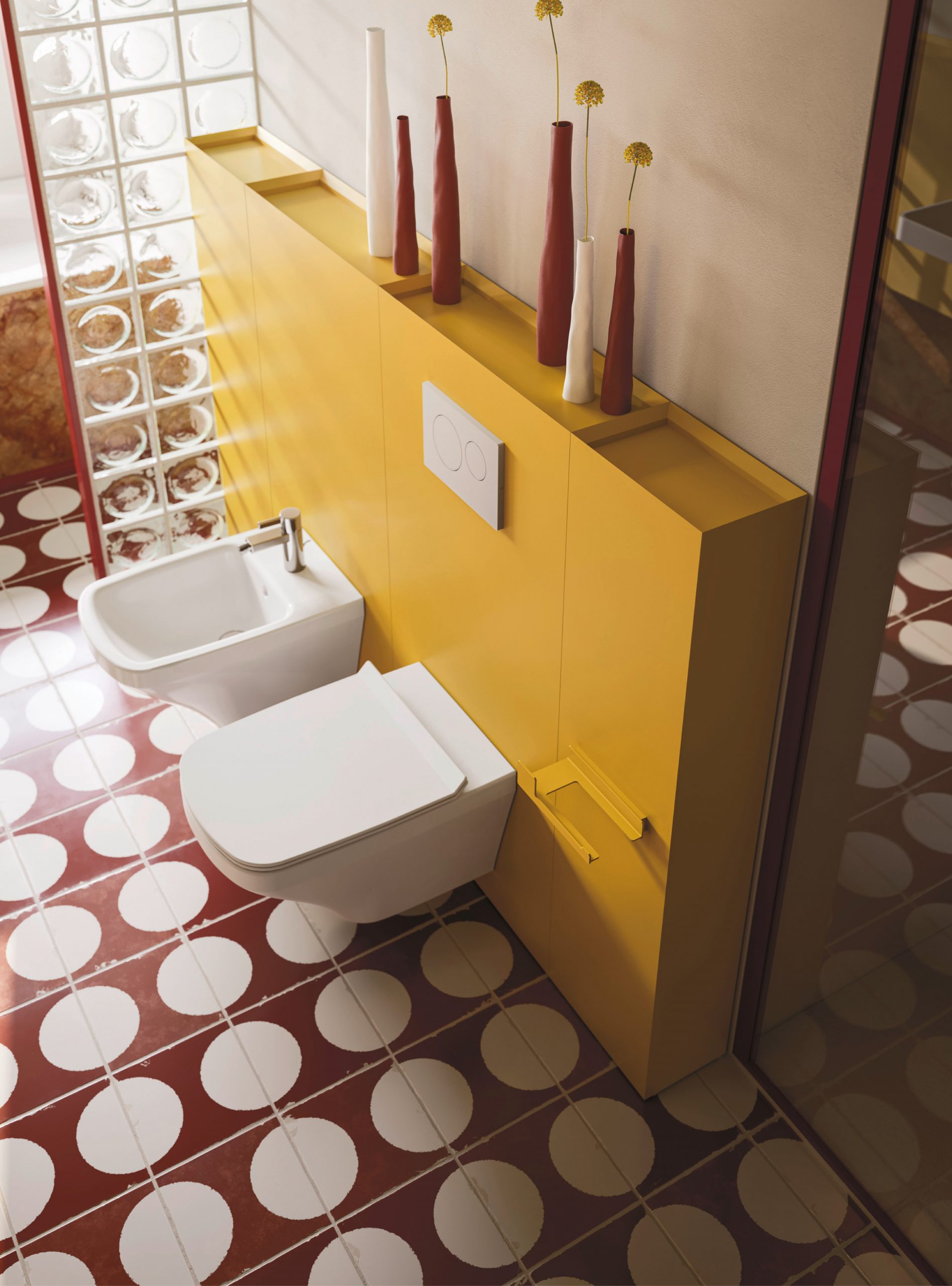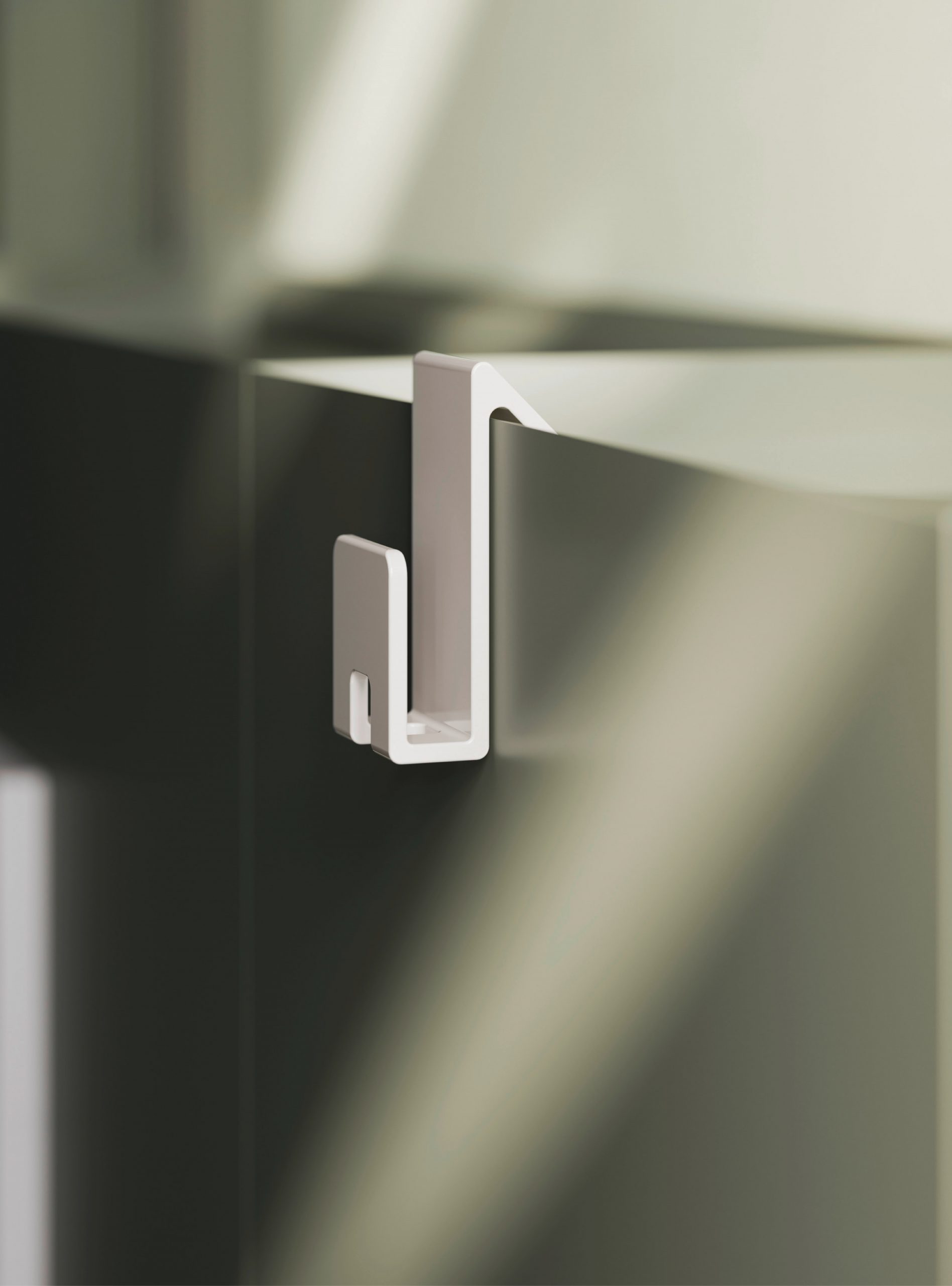 Le lavabo Over, réalisé en Ocritech blanc ou laqué extérieurement de la même couleur que le meuble, est équipé d’un panneau push-pull amovible pour faciliter le nettoyage quotidien et d’un petit bac.