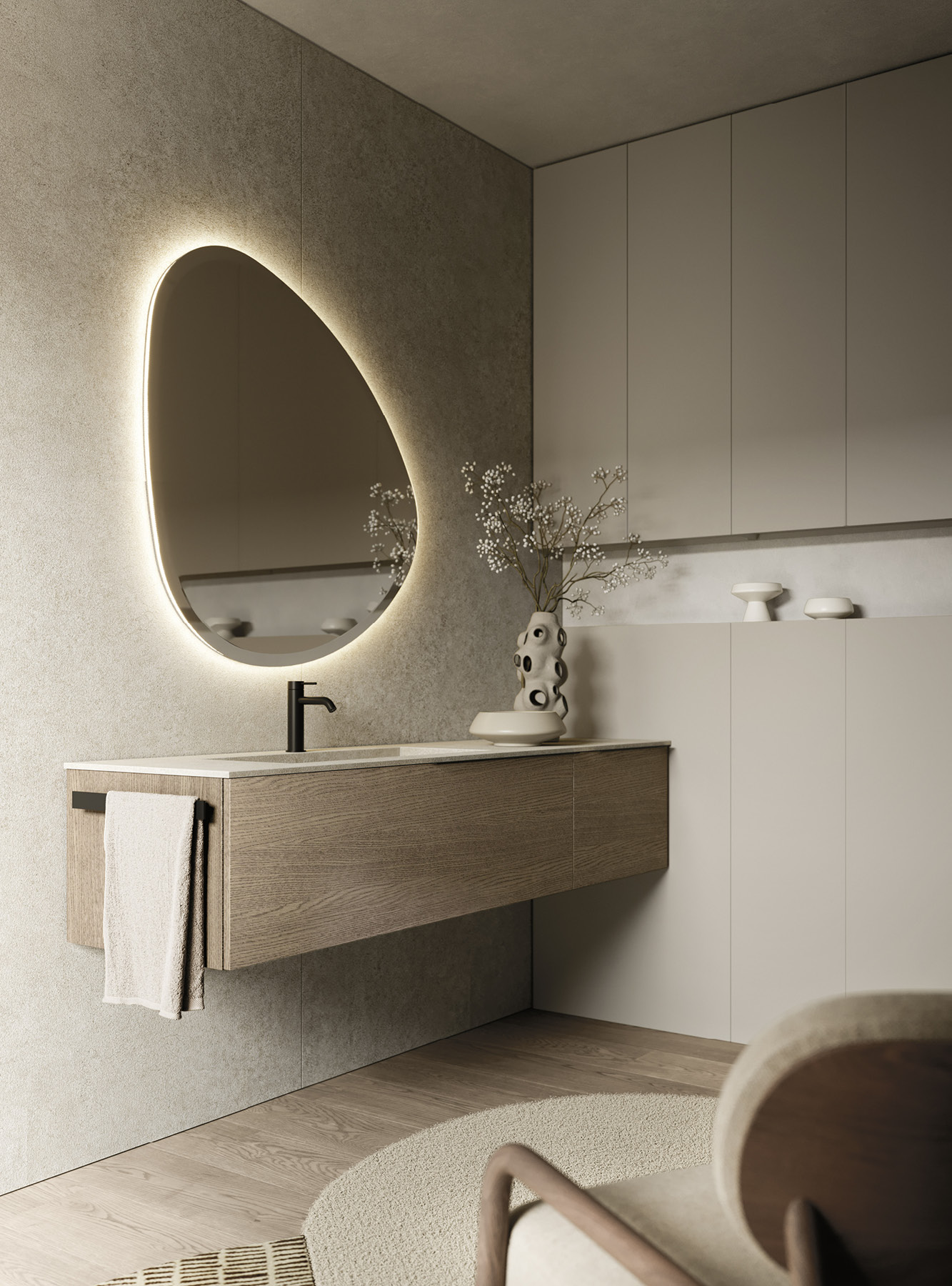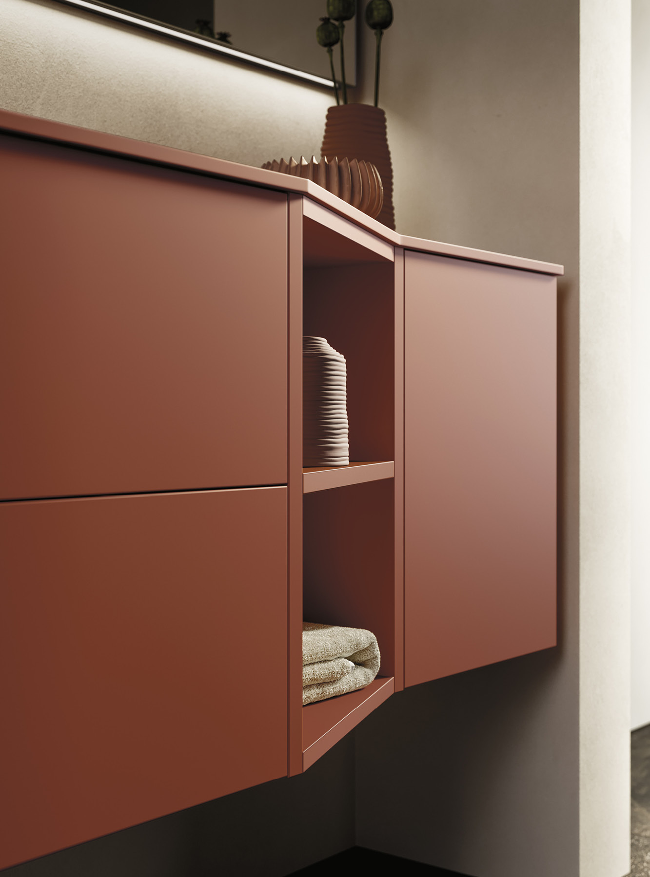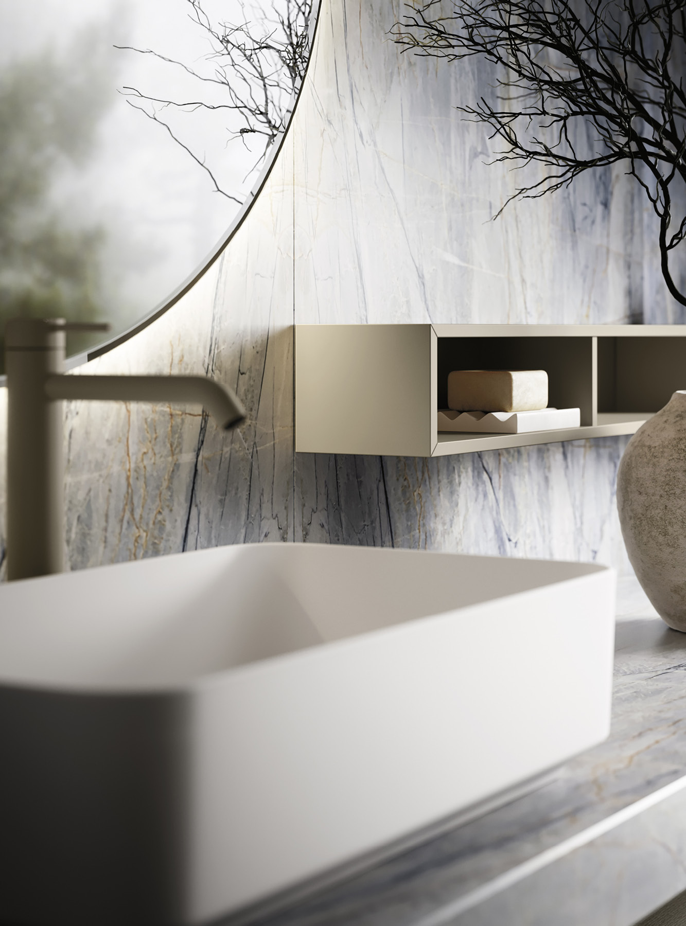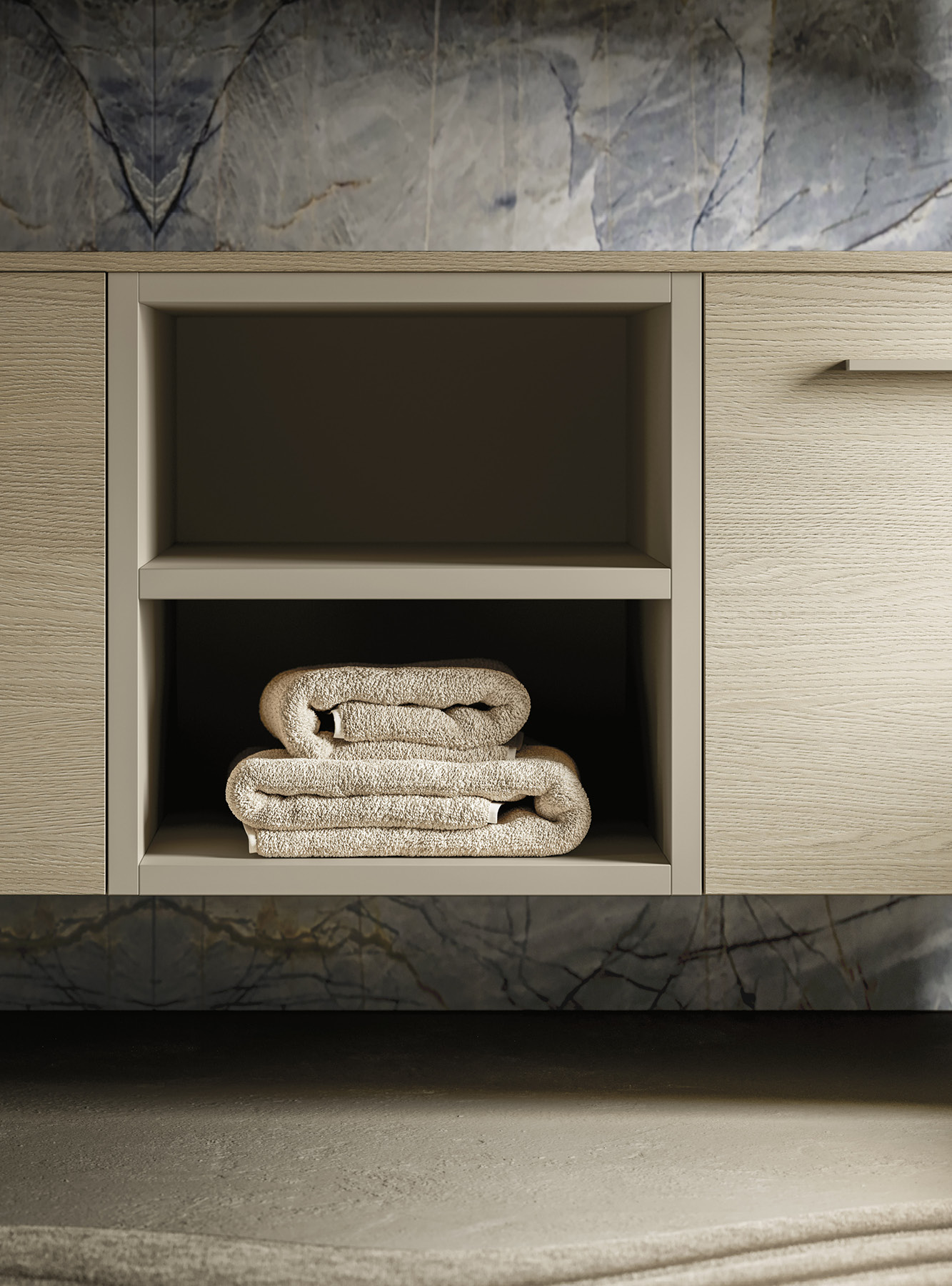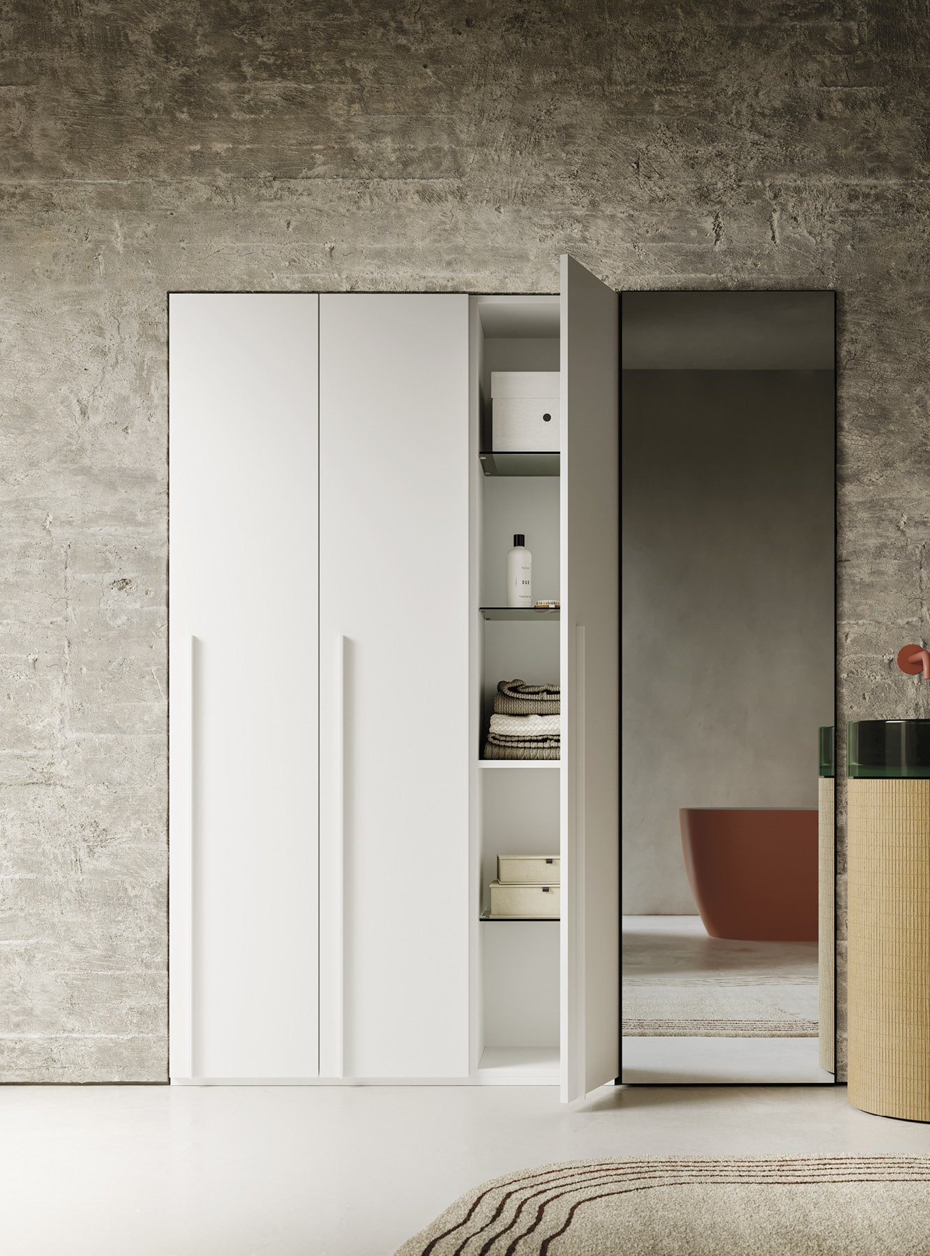 La collection d’ameublement de salle de bain Sky exprime l’essentialité et l’élégance grâce aux meubles de salle de bain modernes et de design, aux lignes droites et sophistiquées. Un projet où rationalité et esthétique coïncident et sont représentées dans de savantes compositions de matériaux et de volumes, expression d’une profonde culture de l’ameublement. Sky, depuis toujours caractérisé par la porte lisse, agrandit sa collection et est maintenant disponible en quatre nouvelles versions « spéciales », Sky U, Sky Gola, Sky Ondina et Sky Pregiati, en meublant différentes salles de bain avec une harmonie raffinée.